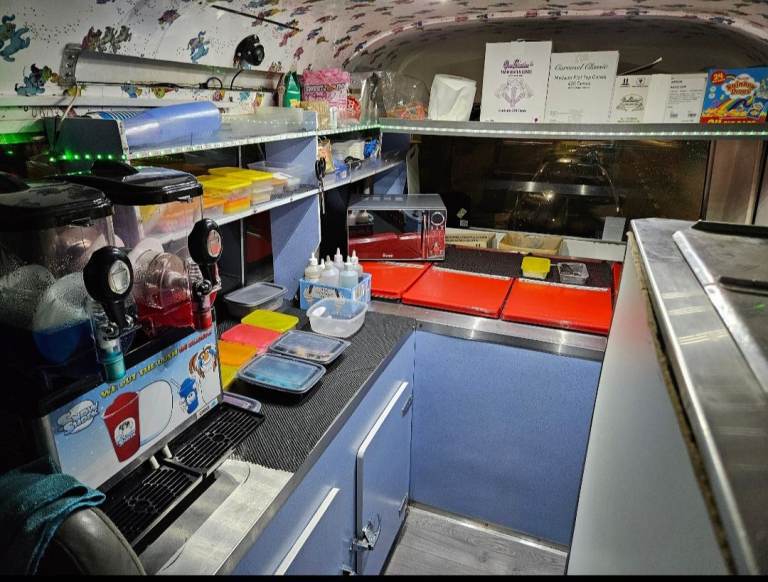 THE VAN HAS LED LIGHTING IN THE WORK AREA, HOT AND COLD WATER WITH STAINLESS STEEL SINKS, LIGHT UP FRONT CONE'S, AND HAS A TOP QUALITY GBG SLUSH MACHINE WITH A VERY GOOD QUALITY INVERTER AND ALSO HAS A DIGITAL MICROWAVE FOR HOT DESSERTS PLENTY OF SHELVING ALL ROUND AS YOU CAN SEE IN THE PICTURES AND THE WINDOWS OPEN WIDE SO GOOD TO WORK ON BUSY EVENT