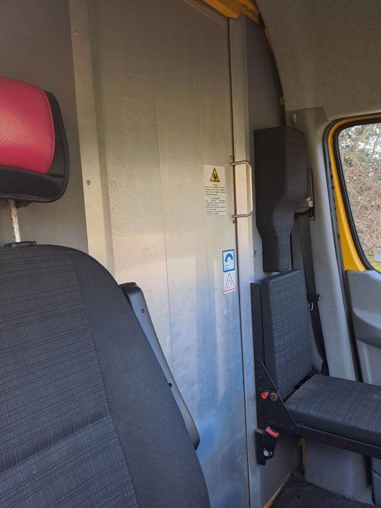 Lockable security safe behind driving seat, fixed to bulkhead.