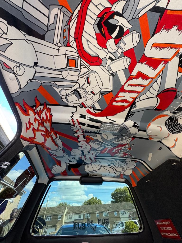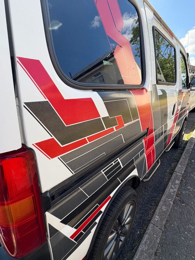 * Striking custom geometric vinyl wrap in red, black, and grey