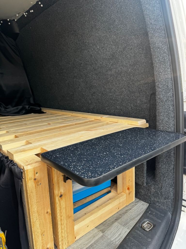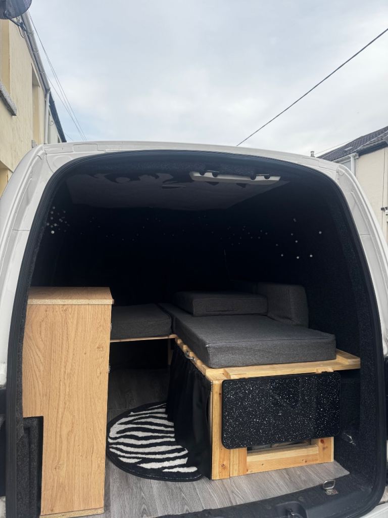 Fitted two black curtains on the rear windows as well as a matching black curtain to separate from the cab. Lots of storage under the bed too.