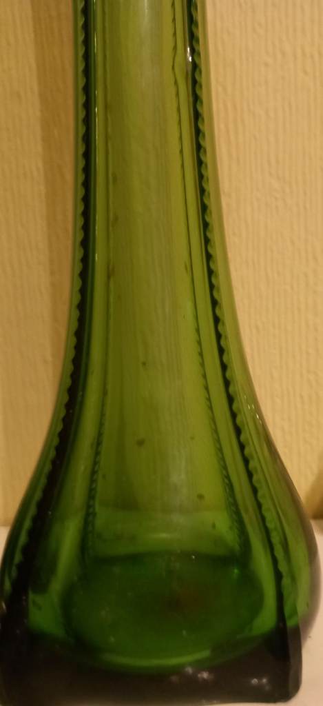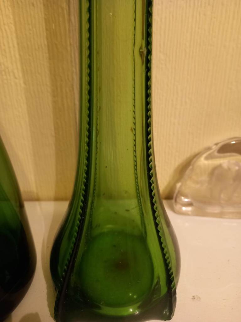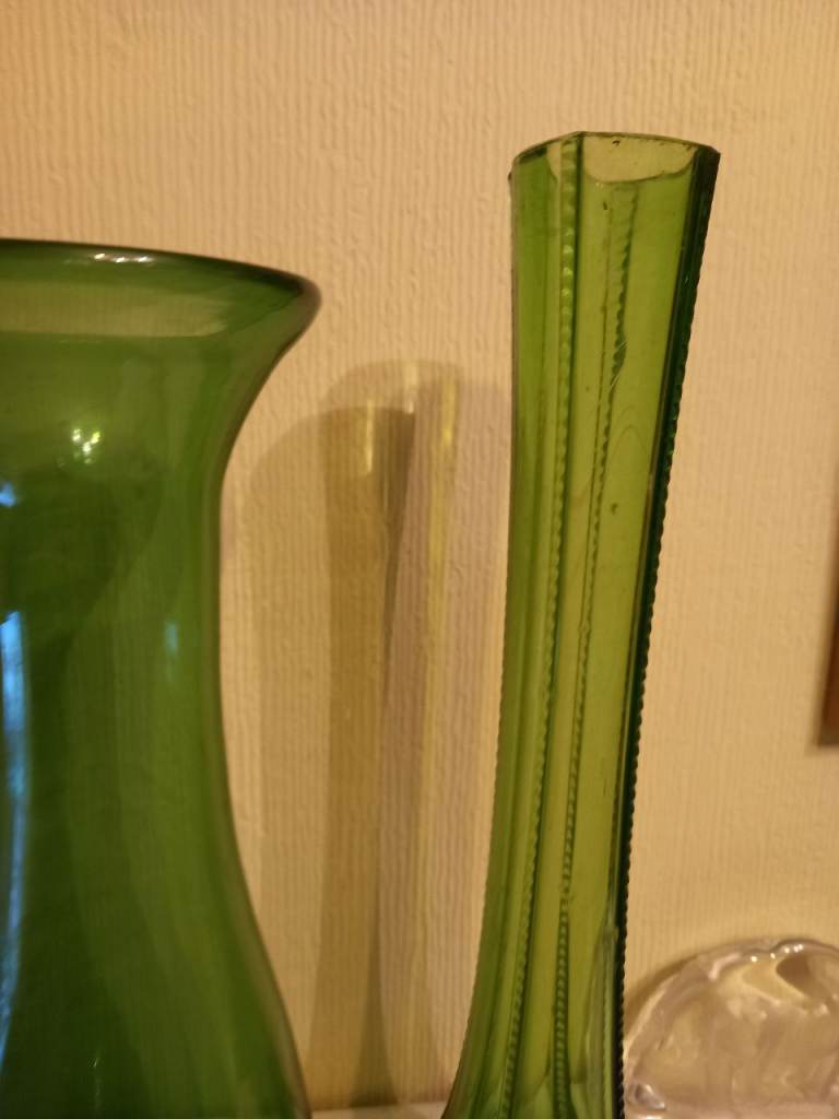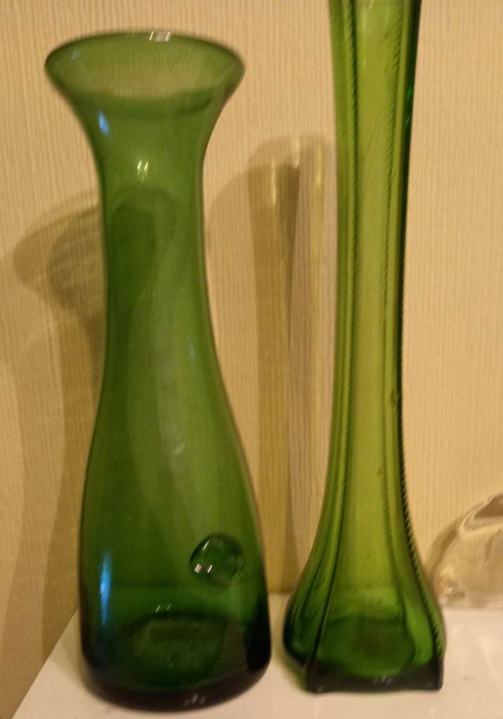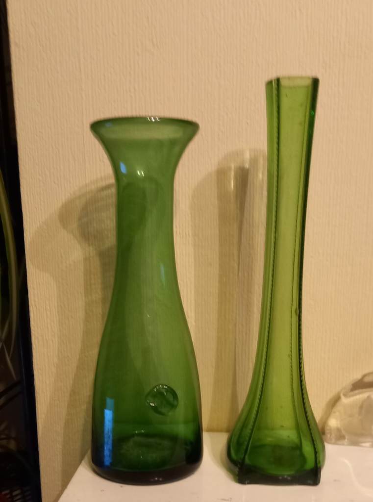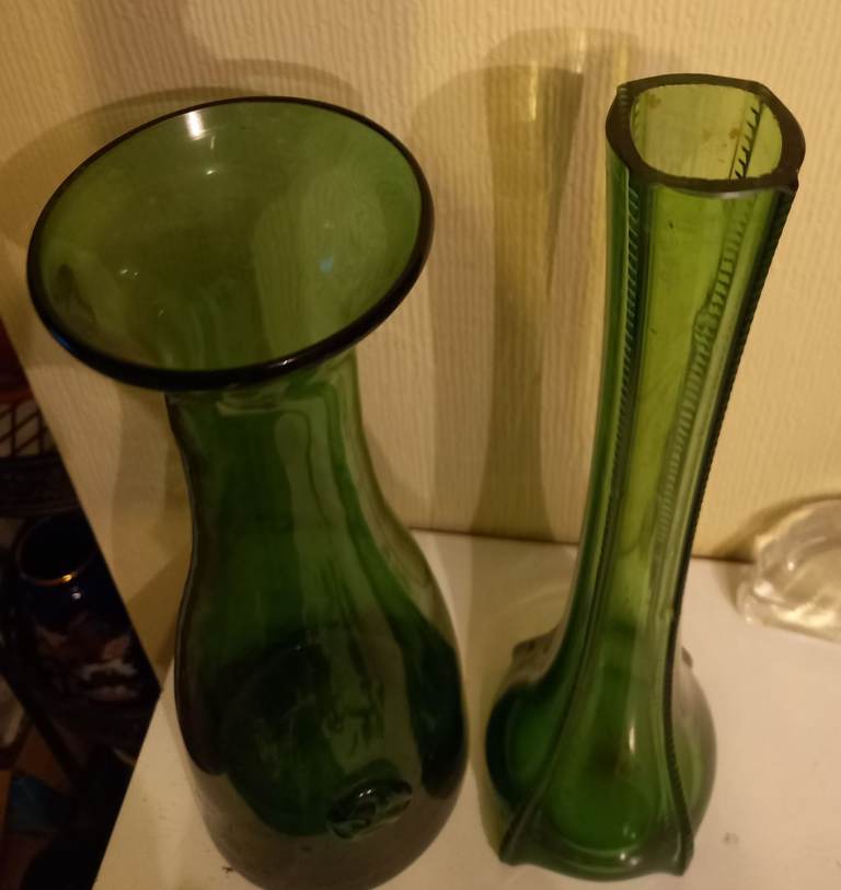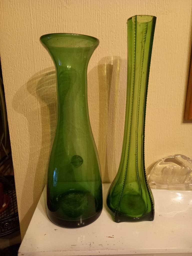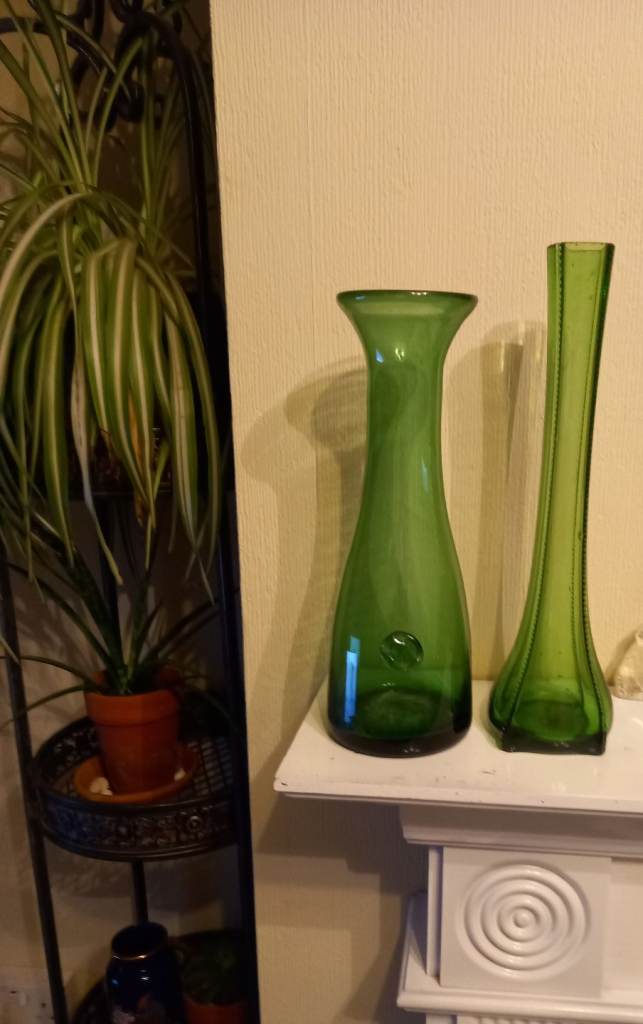 2 x green glass vases , 1 hand blown, tallest vase 33cm H.