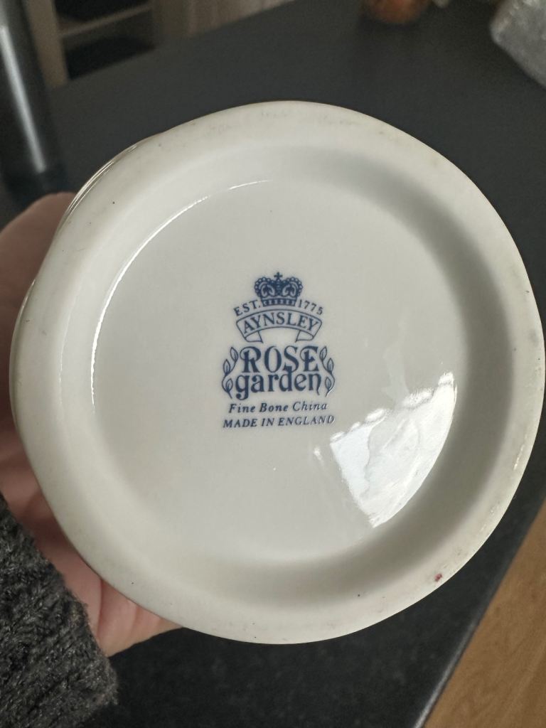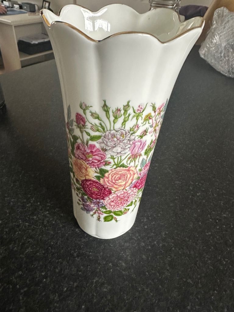 Lovely Aynsley “Rose Garden” fine bone china vase with scalloped rim and gilt detailing. Classic English floral design in excellent condition.