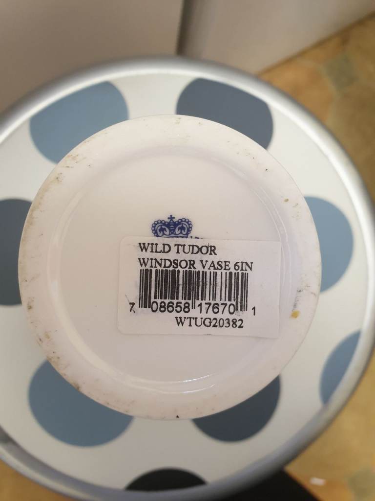 This particular example is from the popular Wild Tudor range and is called the Windsor vase. It is believed to date from circa 1980s. It is of bone china construction. The body is cylindrical in shape with an integrated base and frilly rim above the shapely neck. It is basically white in colour with a large bunch of pastel coloured flowers to the front and a smaller similar image to the back with a liquid gold line round the rim. It has the original navy blue maker's label to one side and item label to the base. It is 6 inches in height.