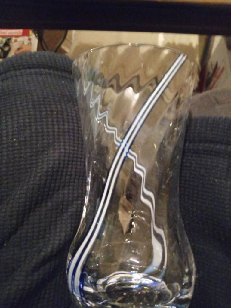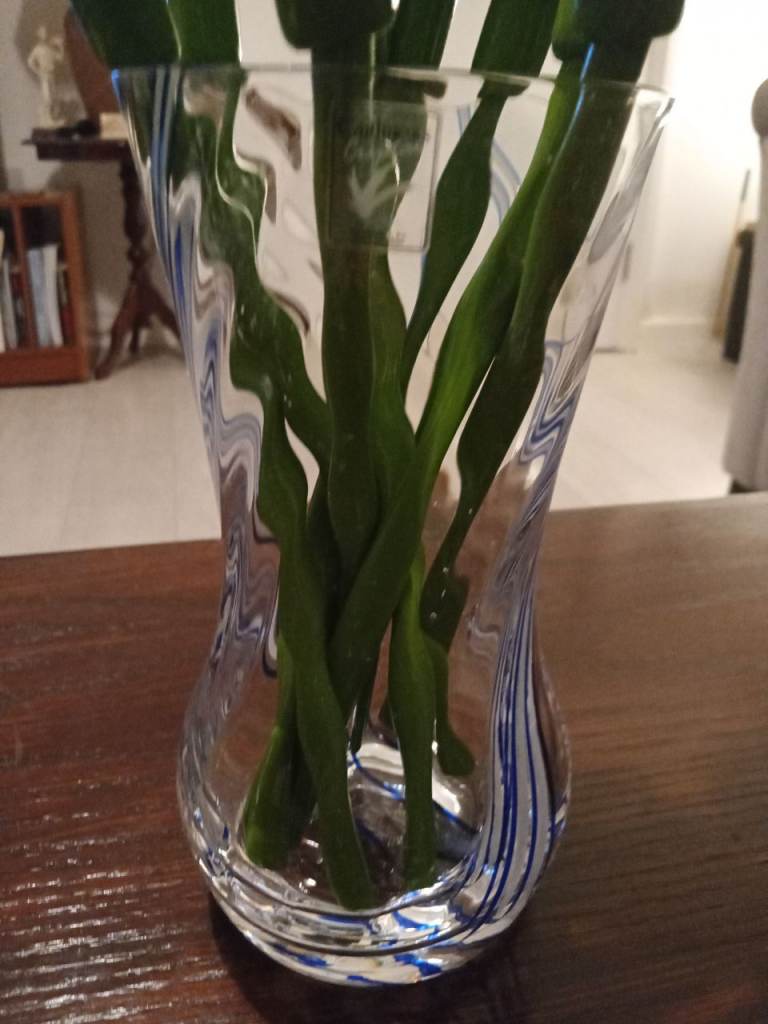 Caithness crystal vase with 9 hand crafted wooden tulips varying colours the vase has a blue and white design running from the base to the rim and still has the Caithness crystal label on the vase