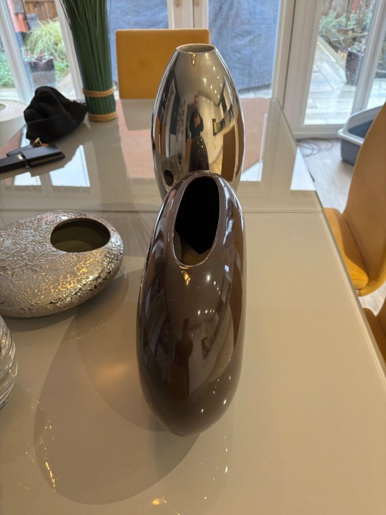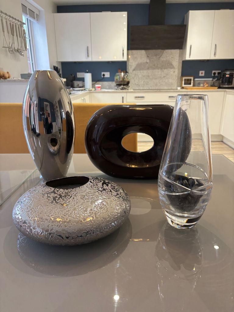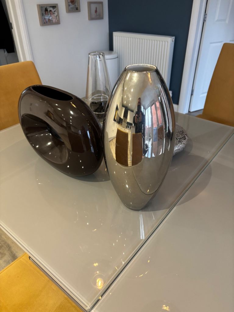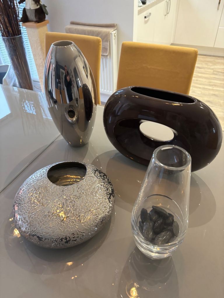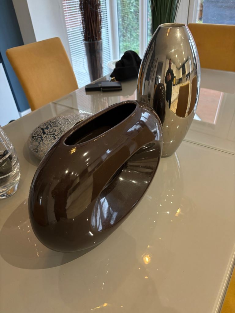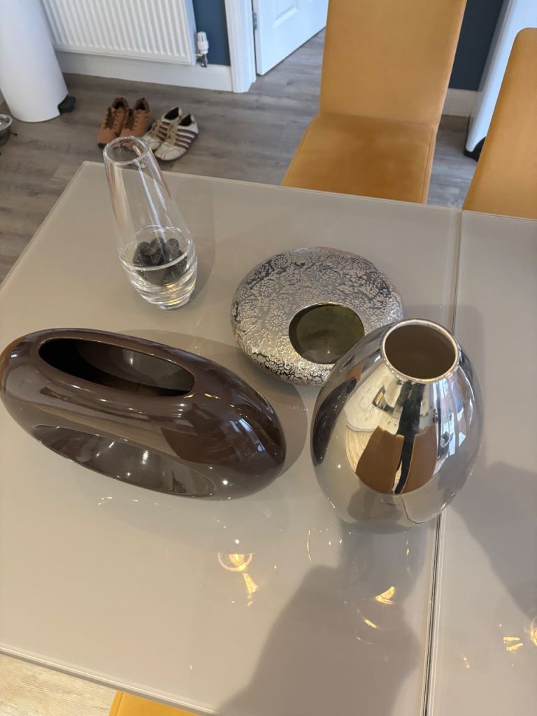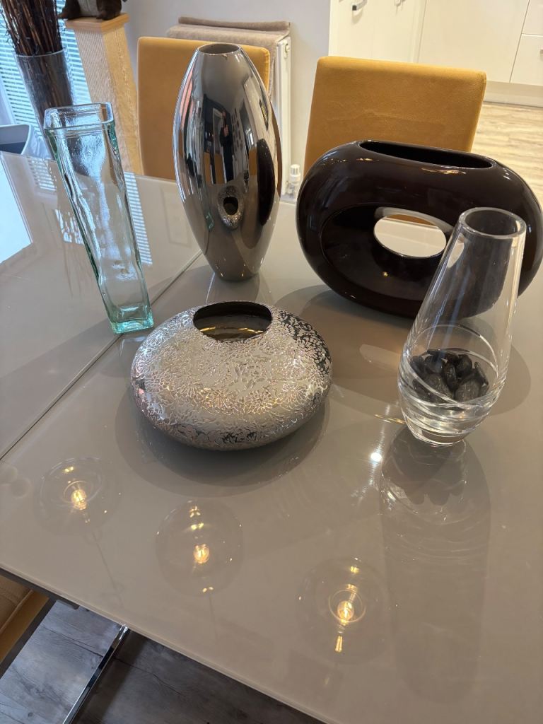 5 vases, (2 quite unusual) for cut or dried flower arrangements, all in excellent condition, no chips or cracks. Silver torpedo vase stands 15" (38cm) high. Flat round silver embossed vase is 12" (30cm) in diameter, with an opening of 4"(11cm) for an oasis. Brown oblong stands 10" (26cm) high x 14" (36cm) wide, cut glass vase is Dartington and stands 12" (30cm) high, rectangular glass stands 13" (33cm) high. All are perfect for crafters/arrangers. Dartington vase alone cost £35 so an absolute bargain for all 5 at £25. Collection only from TA4 area.