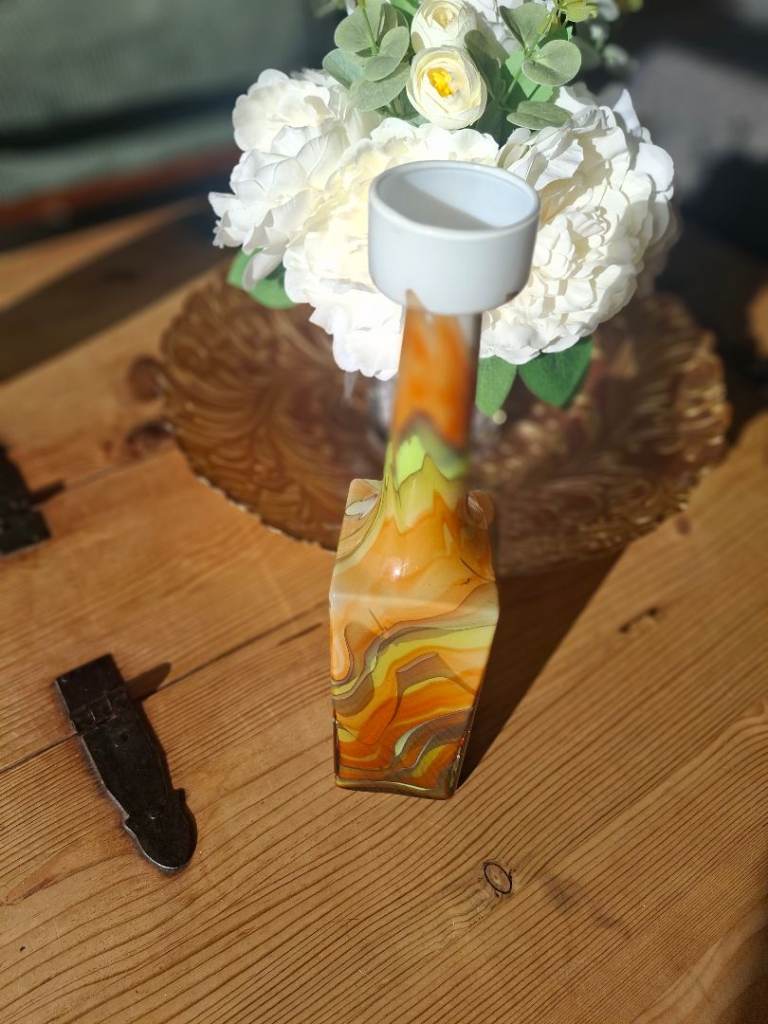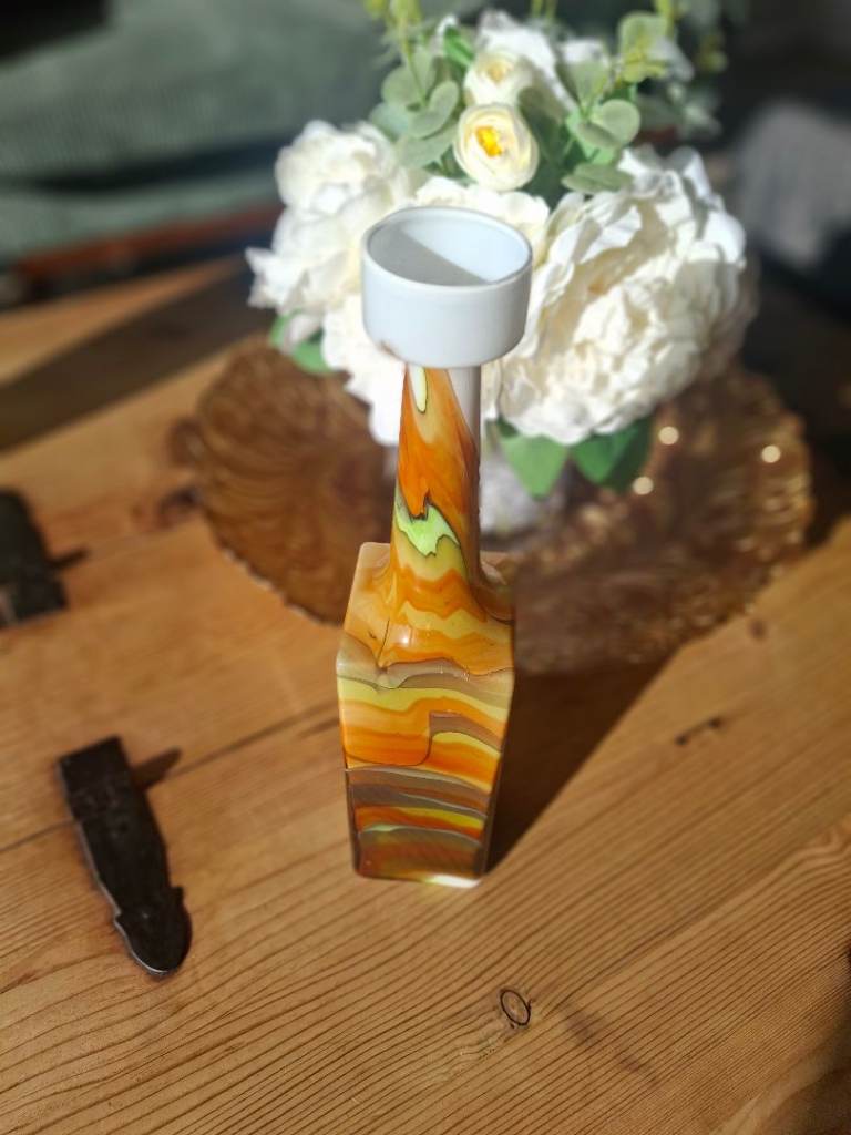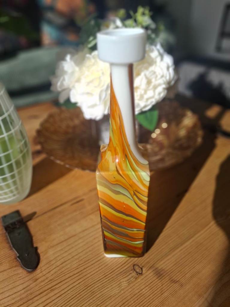 Lovely glass bottle, multicoloured with a swirl pattern.