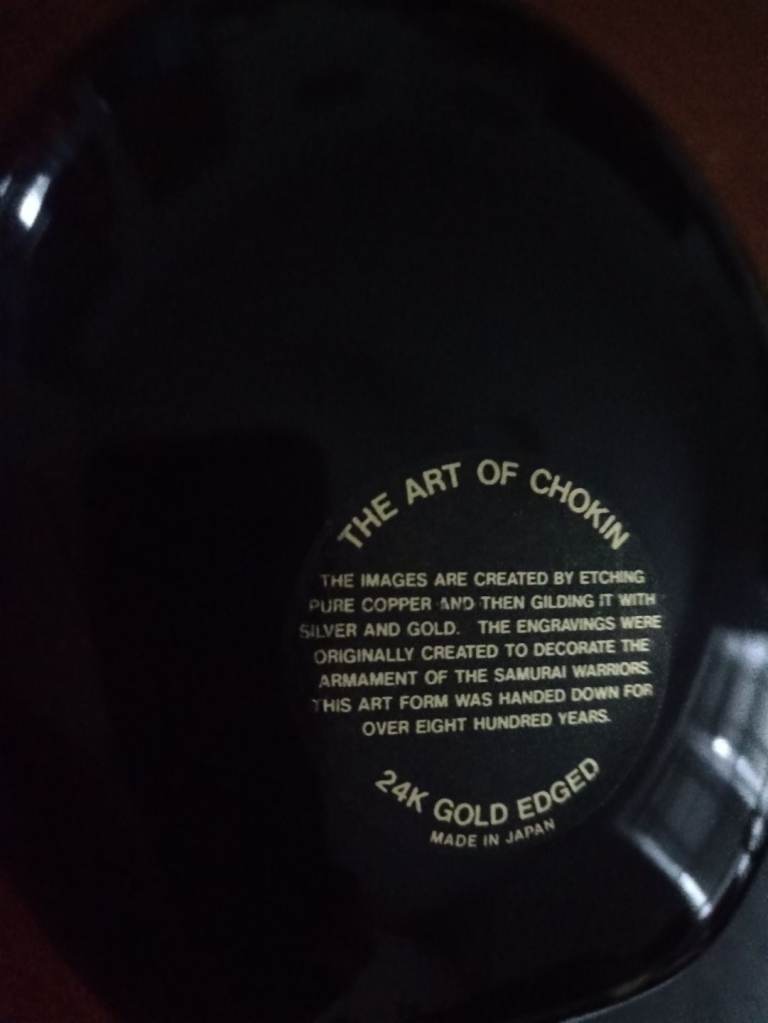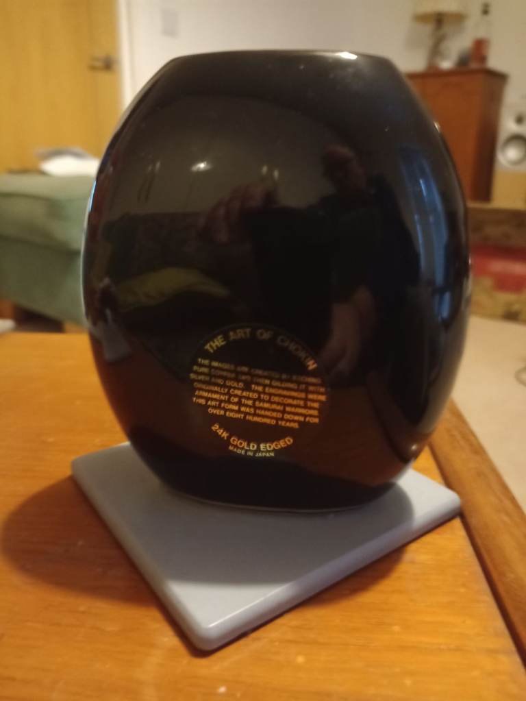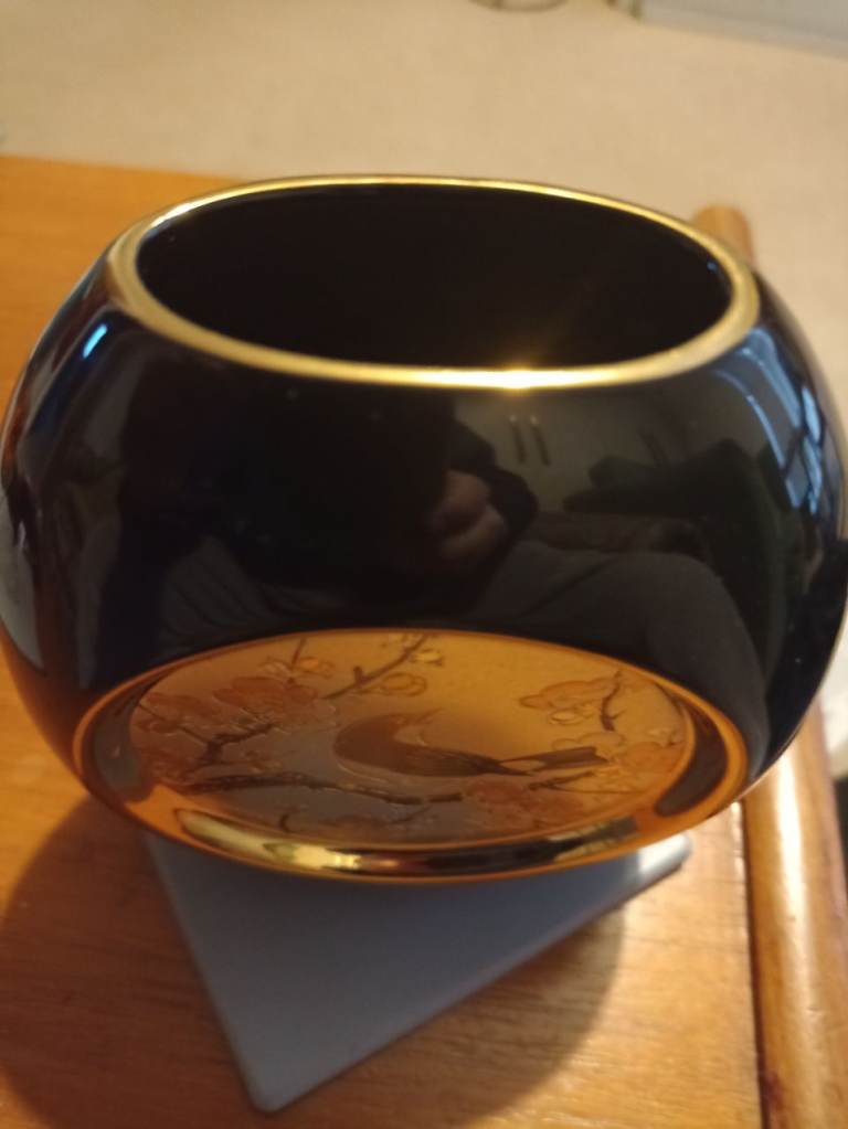 A Chokin bud vase in black with 24 carat gold engraving. Depicting a bird in a tree.A beautiful example with no damage or blemishes. 13cm high. 11cm width.Sorry no offers as this is a bargain price. Cash on collection only please.