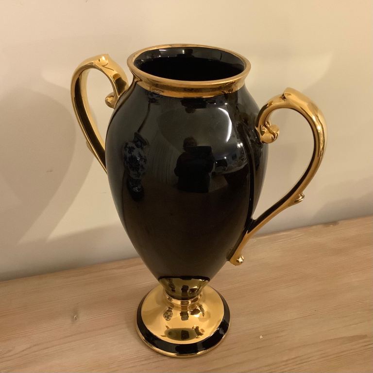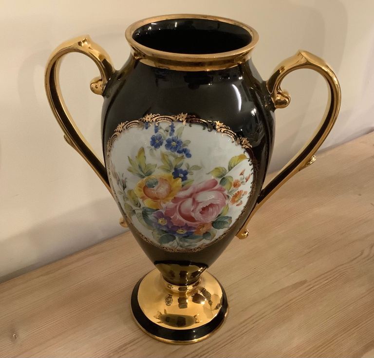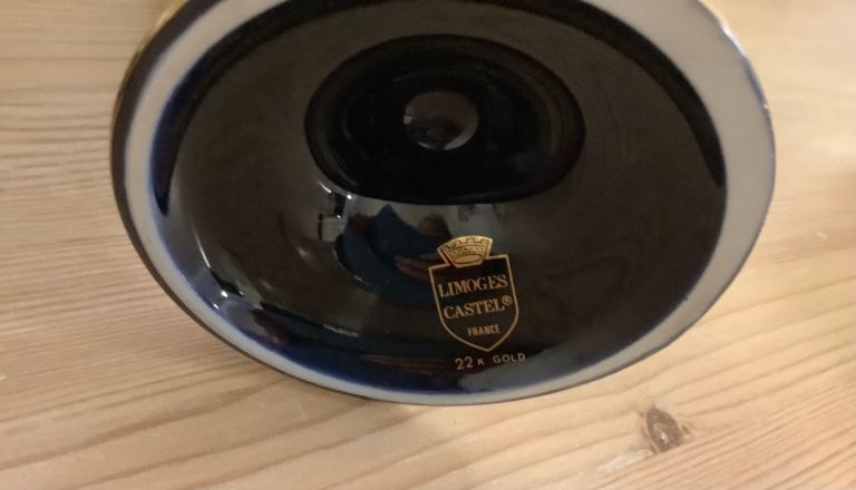 Beautiful Limoges vase for sale. Cobalt blue with floral design and 22k gold handles. 25 cms tall. Excellent condition.