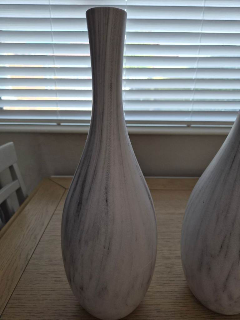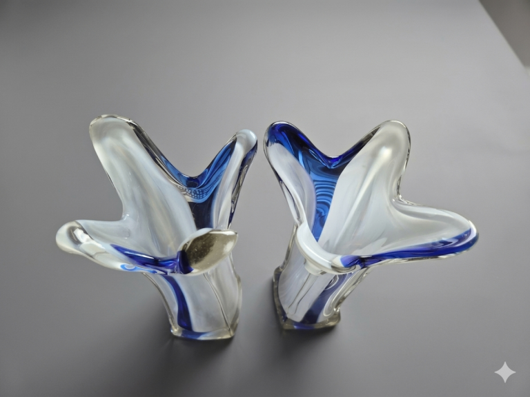 Pair of heavy art glass vases, each standing 35cm tall. They feature a pulled, free-form rim that creates a star-shaped or floral opening.