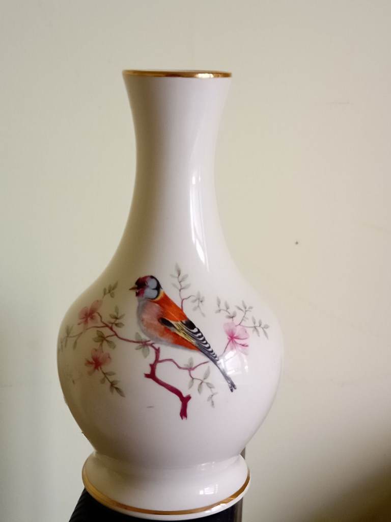 Pretty vintage Bud vase with birds and flowers painted on a white vase.