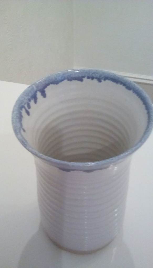 Hand thrown Stephen Llewellyn pottery vase in cream and blue, height 30 cm. Collection only.