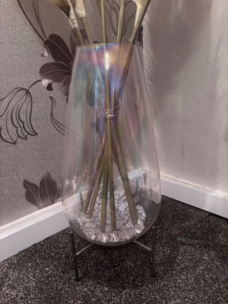 Large glass iridescent vase on a stand with 7 grey fake pampas grass excellent condition both from dunelm