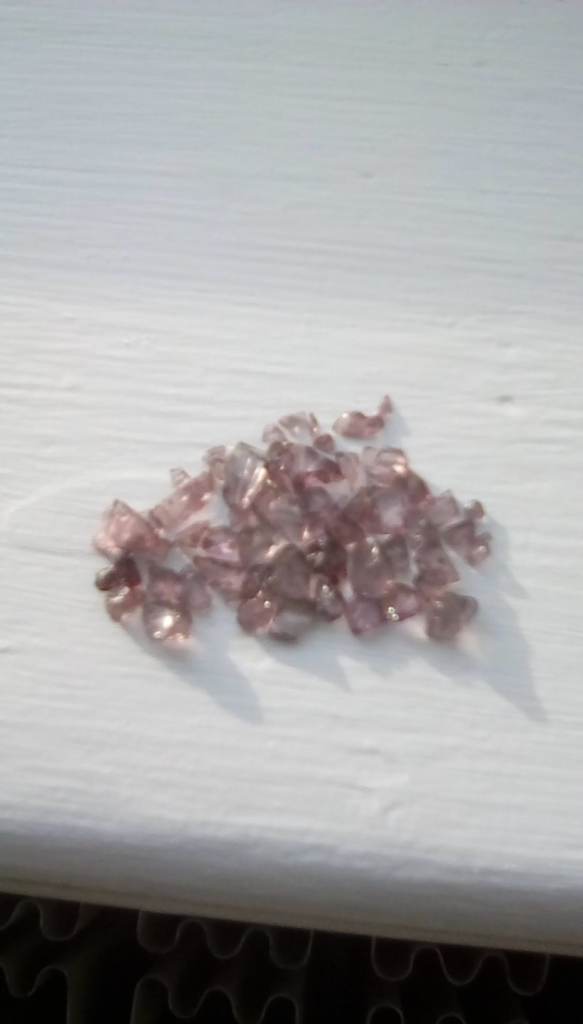 Four sided round topped clear glass vase filled with small dark crystal type stones, height 32 cm. Collection only.