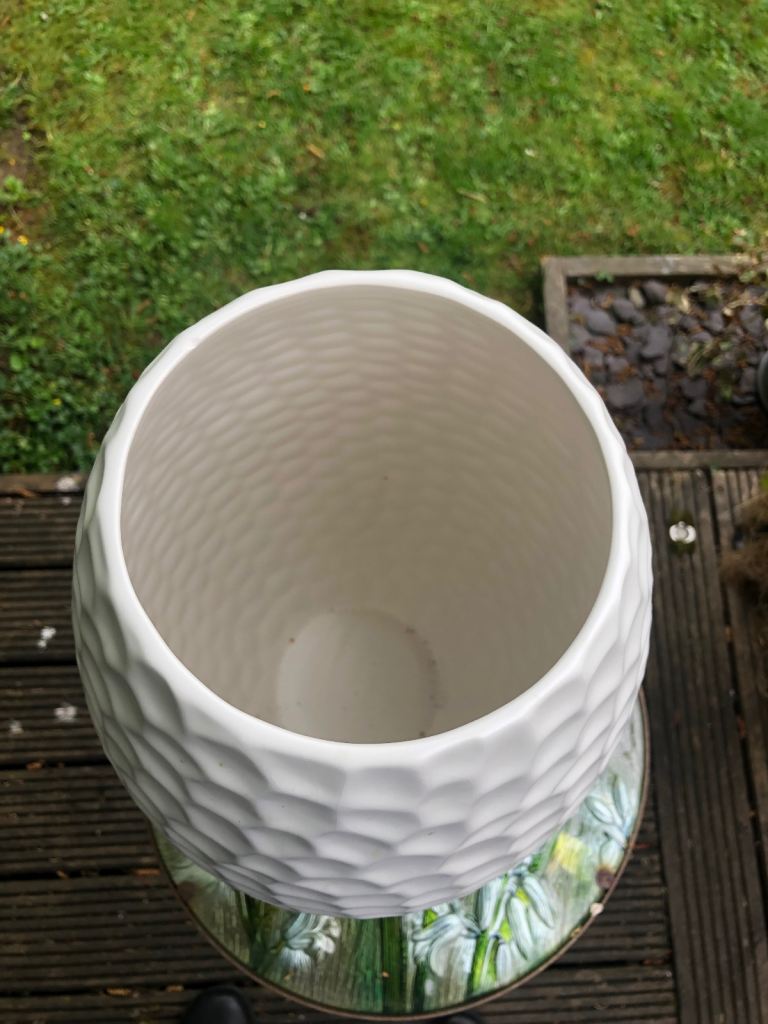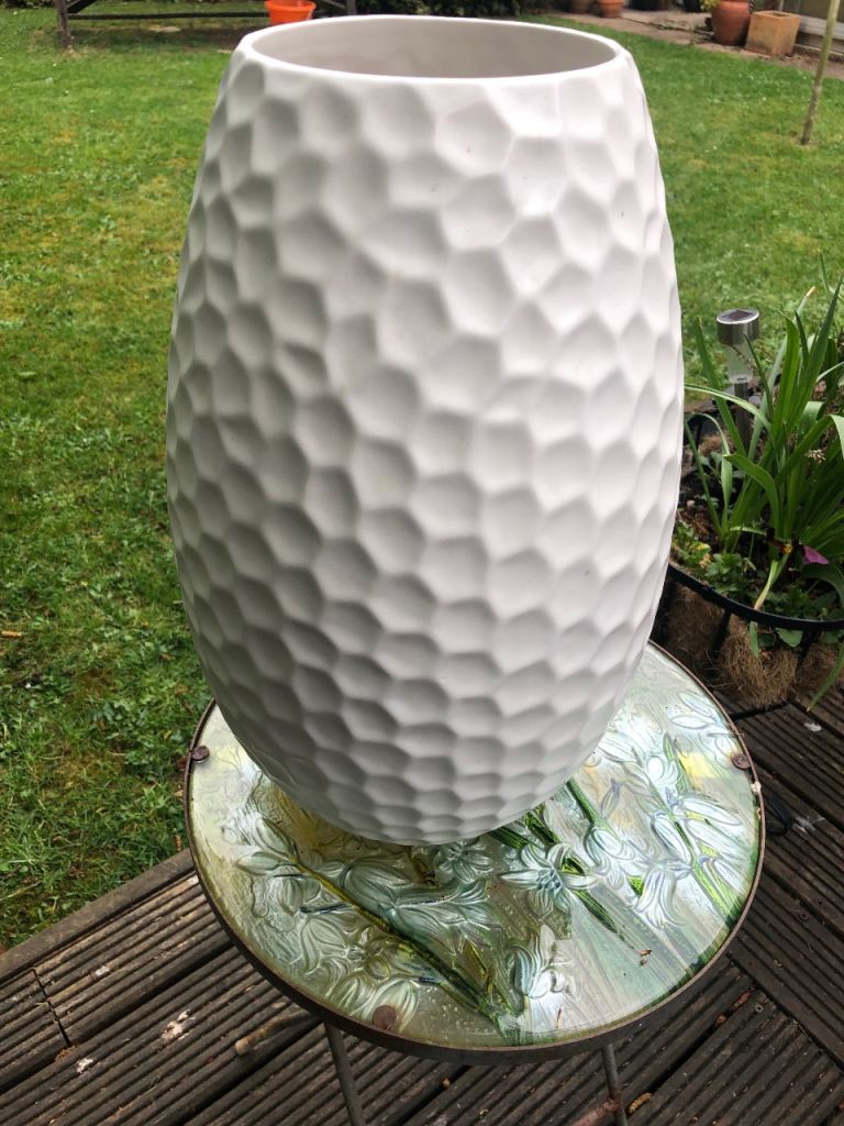 Large white hammered effect ceramic vase for sell. In excellent condition. Approximate height 16 inches (40.6 cms) with diameter of 5.5 inches (14 cms).
