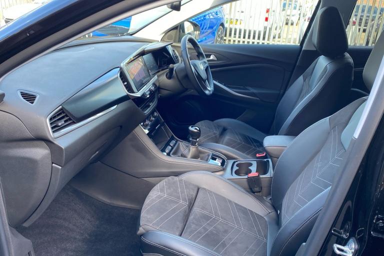 Presenting a 2021 Vauxhall Grandland Ultimate finished in striking Carbon Black metallic. This used SUV offers a refined and spacious interior with room for five passengers and generous boot capacity of up to 1652 litres making it a great option for families or those needing extra space. Powered by a 1.2-litre turbocharged petrol engine delivering 128 hp it offers an engaging drive and a combined fuel efficiency of 46.3 mpg. The manual transmission provides added control and connection to the road while features such as 19-inch diamond-cut alloy wheels and advanced IntelliLux LED headlights enhance both style and visibility. With practical touches like a power tailgate with foot sensor and a 360-degree panoramic parking camera daily journeys are made easier. Capable of reaching up to 122 mph and accelerating from 0-62 mph in 10.4 seconds this Grandland balances comfort with performance.