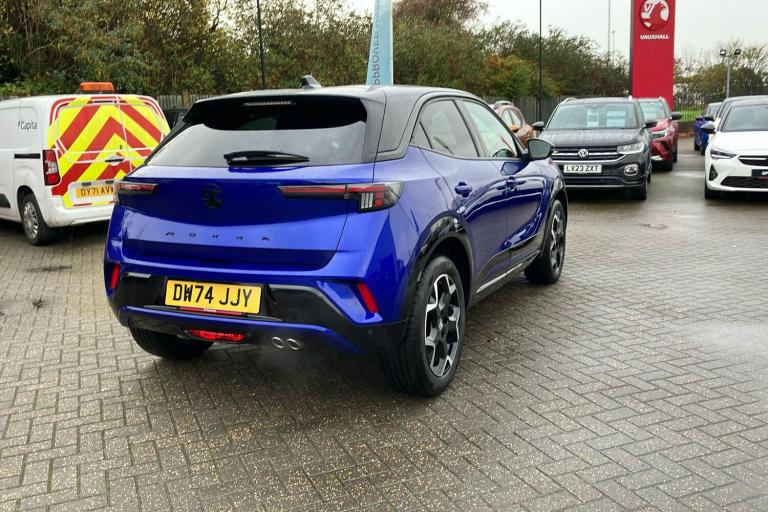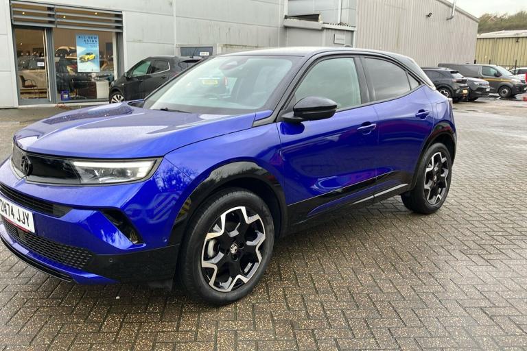 Presenting the 2024 Vauxhall Mokka Ultimate finished in striking Colibri Blue metallic paint. This stylish five-door SUV offers a contemporary look with black detailing throughout including diamond-cut alloy wheels and a black roof. Inside you will find ambient lighting and a panoramic rear-view camera for a modern driving experience. The eight-speed automatic gearbox paired with a responsive 1.2-litre turbocharged engine delivers up to 128 horsepower and a top speed of 126 mph. The Mokka provides seating for five and delivers up to 46.3 mpg combined making it efficient for everyday journeys. Practicality is assured with 350 litres of boot space expanding to 1105 litres with the seats folded. With one previous keeper and packed with thoughtful touches this Mokka Ultimate is an appealing option for those seeking comfort and flair in their next used SUV. This vehicle is ULEZ compliant.