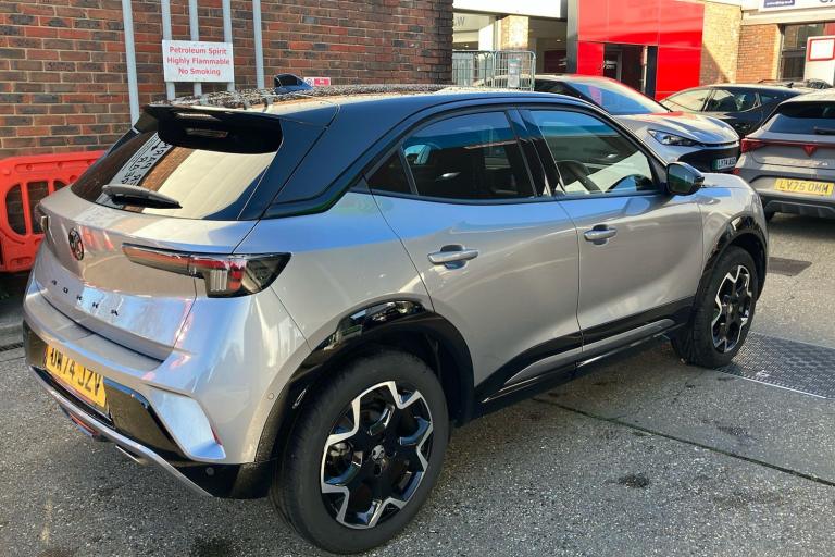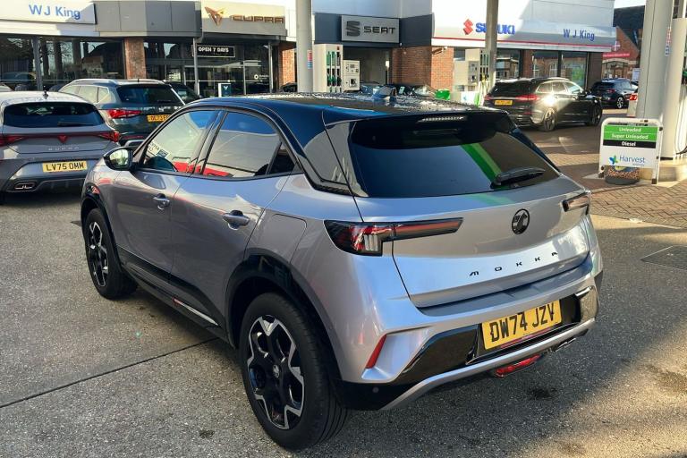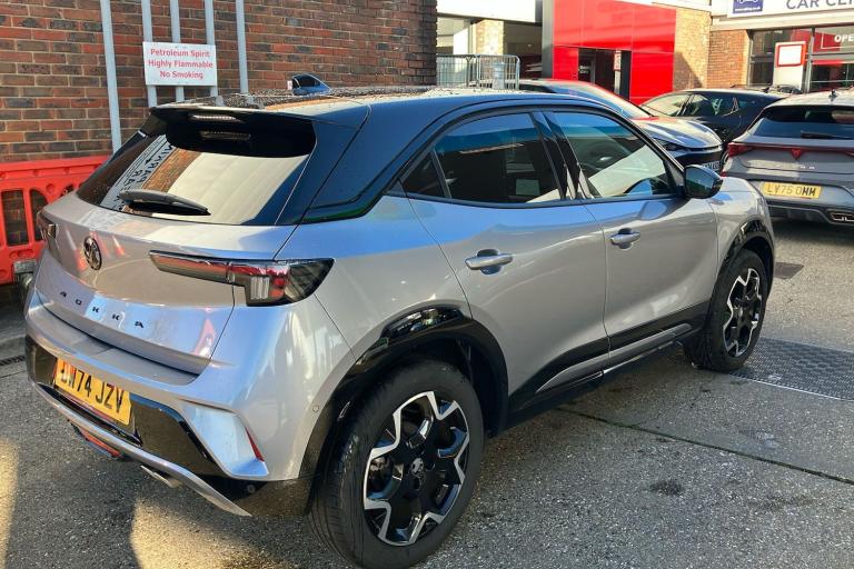 Introducing the 2024 Vauxhall Mokka Ultimate finished in striking two coat metallic Contrast Grey. This stylish SUV combines generous space with an efficient 1.2 Turbo petrol engine and a smooth automatic transmission. Offering seating for five and a versatile boot with up to 1105 litres of space it adapts effortlessly to your lifestyle. Designed for comfort and ease it features handy touches such as a heated steering wheel and seats ambient lighting and intuitive controls. Modern conveniences include a wireless mobile phone charger panoramic rear-view camera and seamless smartphone connectivity. With a combined fuel economy of 46.3 mpg and a top speed of 126 mph this model balances performance with practicality making it ideal for daily commutes or weekend adventures. This car is ULEZ compliant meaning you can drive in low-emission zones with confidence. Experience contemporary driving at its finest in the Vauxhall Mokka Ultimate.