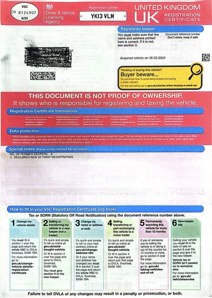 - Original number plateAdvisoryDifferent number plates are commonplace. Ensure the number plates on the car match the V5C documentation. Be sure of what number plate comes with the car you are buying.