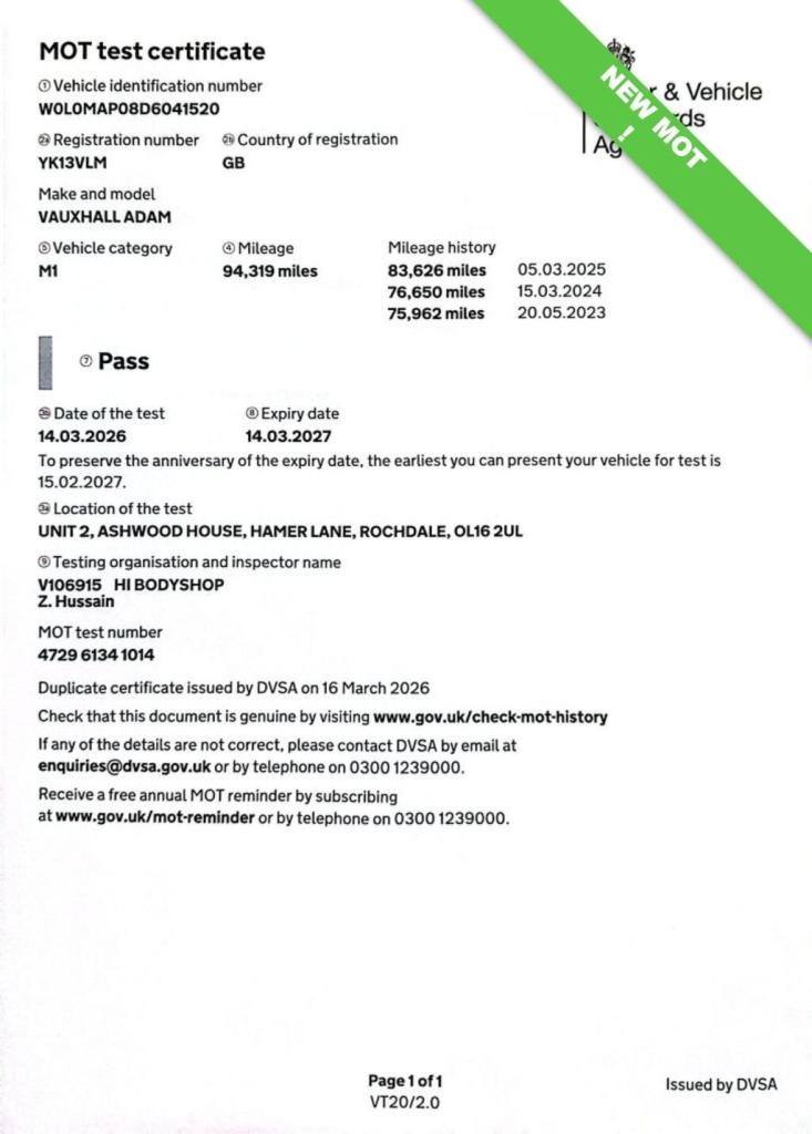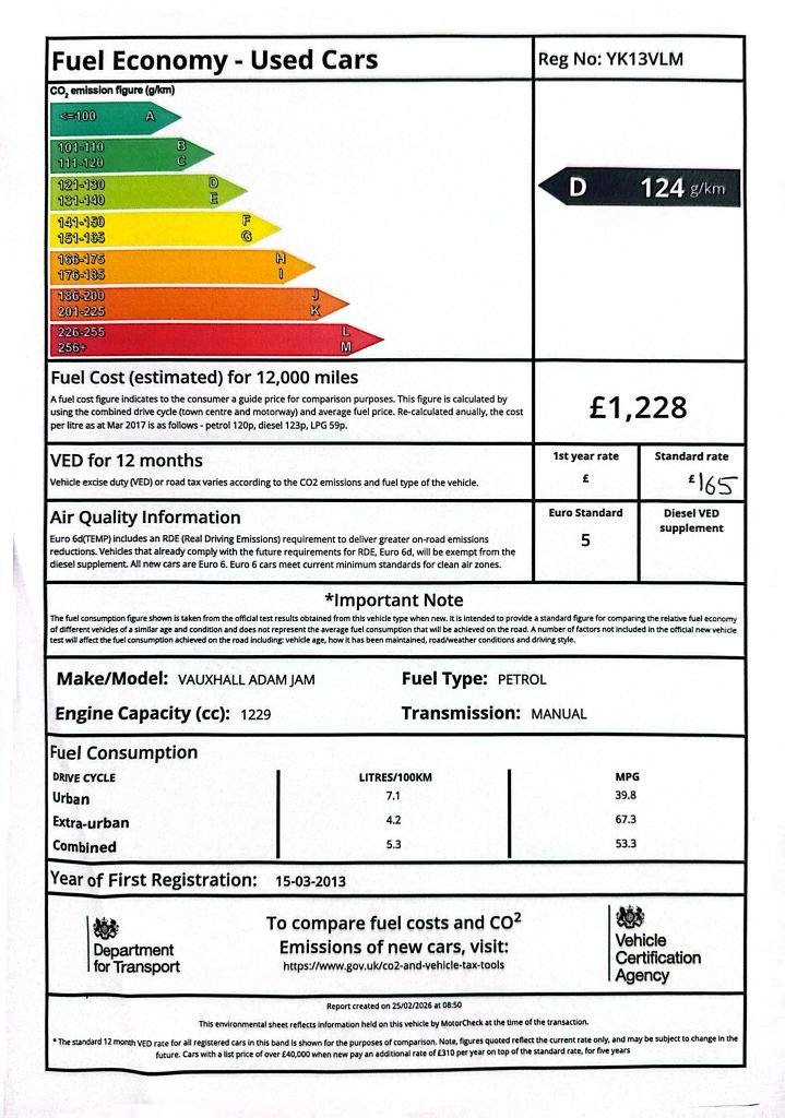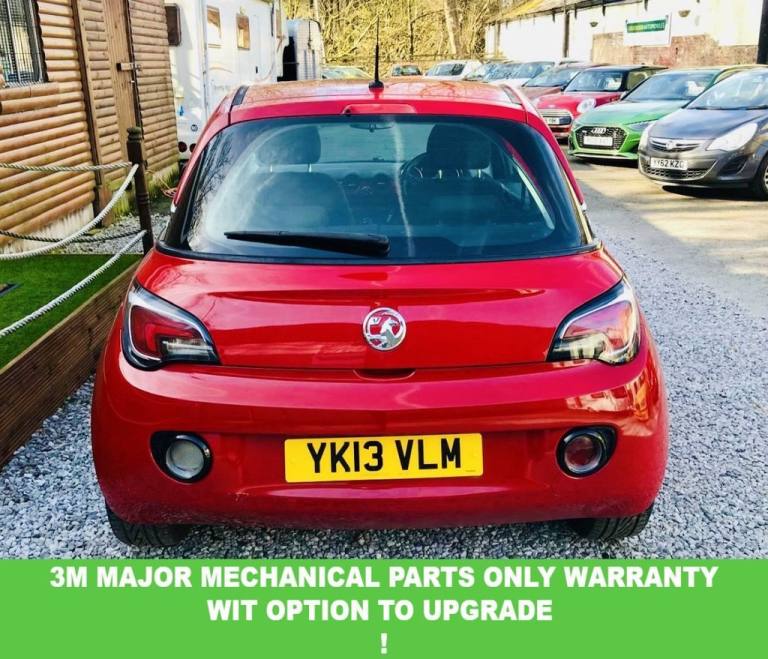 This 2013 Vauxhall ADAM JAM is presented with a recent service completed on 16TH Marc 2026 at 94,296 miles, along with 2 new shock absorbers and a tie rod end and a new MOT ensuring it is ready for its next owner. This stylish JAM variant is equipped with a 1.2 litre petrol engine and comes with a 3 month warranty for your peace of mind. Enjoy a comfortable driving experience with the Electronic Climate Control and Air Conditioning, perfect for any weather. Stay connected on the go with Bluetooth connectivity. This Vauxhall ADAM also benefits from being in a low insurance group 3, making it an economical choice compared to many other vehicles. Leather multifunction steering wheel. The colour combination of black and red compliments both outside and inside this car. Great specification with Bluetooth media with AUX / USB / 12V PLUGINS. All our vehicles over £3000 come with our 5 Star package! * Full service with new oil, oil filter, air filter and pollen filter, and brakes, lights and levels checked. * Minimum of 9 Months MOT or a will have a Brand new one! * 6 Month comprehensive parts and labour warranty F.O.C.! * Full valet prior to collection! * HPI Clear with PDF Report (unless clearly stated otherwise) Extended warranties available at competitive rates. Give us a call to make your next purchase a special purchase. FCA Regulated, Finance available Subject to status! 5 Day Driveaway insurance available at small cost (circa £30) to get you on the road sooner than you think. Secure any car with a small deposit. Airport/Train station collection service All our Part X to clear cars (under £3000) come with our Budget 4 star package! * Minimum of 5 Months MOT or a will have a Brand new one! * Lights and levels checked! * HPI Clear with PDF Report (unless stated) * 3 months Major mechanical parts warranty.COMBINED MPG OF 53.3 LOW INS GROUP 3, 2 KEYS LOW INSURANCE, 3 M WARRANTY WITH OPTION TO UPGRADE, ALLOY WHEELS BLUETOOTH, JUST HAD FULL SERVICE AND NEW MOT , Tyre Pressure Monitoring System with Individual Tyre Pressure Display, Red n Roll, Climate Control - ECC - Electronic, Style Pack, Stripes Graphics on Roof-Bonnet-Door Mirrors-Lower Door in Red n Roll, Twisted Red Pack, 12V Power Socket - Centre Console, 16in Alloy Wheels - Horns, 20 Watts Per Channel Output, ABS - Anti-Lock Braking System, ADAM - on Both C-Pillars of the Vehicle, Adaptive Brake Lights, Air Conditioning, Air Recirculation System, Airbag - Drivers, Airbags - Deactivation Switch For Front Passengers and Side Impact, Airbags - Front Passenger, Airbags - Side, Anti-Submarining Ramps in Front Seats, Black DLO - Upper Roof Line, Bluetooth Connectivity, Body Colour Facia, Body-Colour Door Handles, Bumpers - Plastic Lower Front Stiffener, CBC - Cornering Brake Control, CD Player - with MP3 Compatability and Radio, Cargo Hooks x2 - Trunk Integrated into Side Trim, Centre Vent Outlets - Adjustable in All Directions, Chrome Effect Interior Door Handles, City Mode Button - Provides Lighter Steering at Parking Speeds, Collapsible Windscreen Wiper System, Colour Keyed Fleece Velour Carpet, Comfort Door Locking, Cruise Control with Speed Limiter, DMB Digital Radio, Daytime Running Lights, Deformation Zones Front and Rear, Dome Light, Door Mirrors - Body Colour, Door Mirrors - Electrically Adjustable-Heated, Drinks Holder - x2 Rear Centre Console, Driver Information Display, Driver and Passenger Seatbelt Force Limiters, Drivers and Front Passengers Internal Central Locking Switch, EBA - Emergency Brake Assist, EBD - Electronic Brakeforce Distribution, ESP - Electronic Stability Programme Plus, Electric Windows - Front with Safety Autoreverse and One Touch Facility, Electronic Odometer and Trip Odometer, Electronic Theft Protection For Audio Equipment, Emergency Tyre Inflation Kit, Energy Absorbing Steering Column, Full Length Curtain Airbags, Fully Carpeted and Illuminated Luggage Area, Global Closing - Windows, Glovebox - Illuminated-Split Level, Grab Handles - Front, Grille - Black Front with Chrome Logo Bar, HSA - Hill Start Assist, Halogen Headlights, Head Restraints - Height Adjustable, Head Restraints - Rear L-Shape, Heated Rear Window with Automatic Timed Cut-Off, ISOFIX For Outer Rear Seats, Illuminated Boot, Immobiliser, Instrument Cluster - Black with Chrome Rings, Instrument Panel