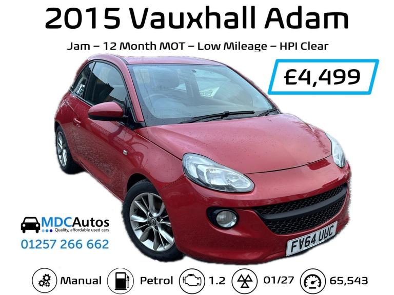 This 2015 Vauxhall ADAM JAM presents a superb opportunity with its remarkably low mileage of just 65,543 miles, a significant advantage for its age, and a clear vehicle history check. This stylish JAM model is equipped with a responsive 1.2L petrol engine and has been cared for by only two previous owners. Inside, you'll find comfortable Ocio Morrocana cloth seats in black, and for added peace of mind, it features a remote control ultrasonic alarm., , The ADAM JAM boasts a suite of desirable features designed for comfort and convenience. Enjoy a pleasant cabin environment with Electronic Climate Control, and embrace the colder months with the Winter Pack, which includes heated seats and a heated steering wheel. The vehicle also sits on attractive 16 inch Titan Triple Cross alloy wheels. Its low insurance group rating further enhances its appeal, indicating that running costs are likely to be more economical compared to many other vehicles in its class., 3 months warranty, 12 months MOT, Full service history, 4 seats, Red, 1 owner, Upgrades - 16in Alloy Wheels - Horns In Silver, Intellilink, Infinity Premium Sound System, Alarm - Remote Control Ultrasonic, 16in Alloy Wheels - Titan Triple Cross, Chrome Pack, Exterior Light Pack, Extreme Pack - Jam, Little Twist Pack - Black, Sight and Light Pack II, Style Pack - Black, Urban Pack, Climate Control - ECC - Electronic, Ocio-Morrocana Cloth - Black, Technical Pack, Winter Pack, Standard Features - 12V Power Socket - Front, ABS - Anti Lock Brakes, AUX Connection, Air Conditioning, Airbags - Curtain, Airbags - Front Side, Airbags - Passenger, Airbags - Passenger Deactivation, Brake Lights - Adaptive, CBC - Cornering Brake Control, Cruise Control, DAB - Digital Radio, Daytime Running Lights, Door Handles - Body Coloured, Door Handles - Interior - Chrome Effect, Door Mirrors - Body Coloured, Door Mirrors - Electric - Heated, Drivers Airbag, EBA - Electronic Brake Assist, EBD - Electronic Brakeforce Distribution, ESP Plus - Electronic Stability Programme, Electric Windows - Front, Emergency Brake Assist, Front Passengers Seat Height Adjuster, Glovebox - Illuminated, HSA - Hill Start Assist, Head Restraint - Height Adjustable Outer Rear Seat, ISOFIX - Outer Rear Seats, Locking Wheel Nuts, Luggage Compartment Cover, Mobile Phone System with Bluetooth Connectivity, Pedal Release System, Pollen Filter, RDS - Radio Data-Traffic System, Radio - Stereo CD MP3 Player, Rake and Reach Adjustable Steering, Remote Central Locking, Remote Control Central Deadlocking, Seatbelt Unfastened Warning - Front, Seatbelt Unfastened Warning - Rear, Seats - Drivers Height Adjustment, Seats - Rear Split Folding 50-50, Side Impact Protection Beams, Speakers - x5, Speed Sensitive Power Assisted Steering, Steering Column - Energy Absorbing, Steering Wheel - Leather, Steering Wheel - Mounted Audio Controls, Straight Line Stability Control, Sunvisors - Twin with Covered Illuminated Vanity Mirrors, Traction Control, Trip Computer - Multi-Function, Tyre Inflation Kit, Tyre Pressure Monitoring System, USB Connection with iPod Control, Windows - Tinted, Wipers - Collapsible Windscreen System, BANK TRANSFER WELCOME - FINANCE AVAILABLE, £4,499