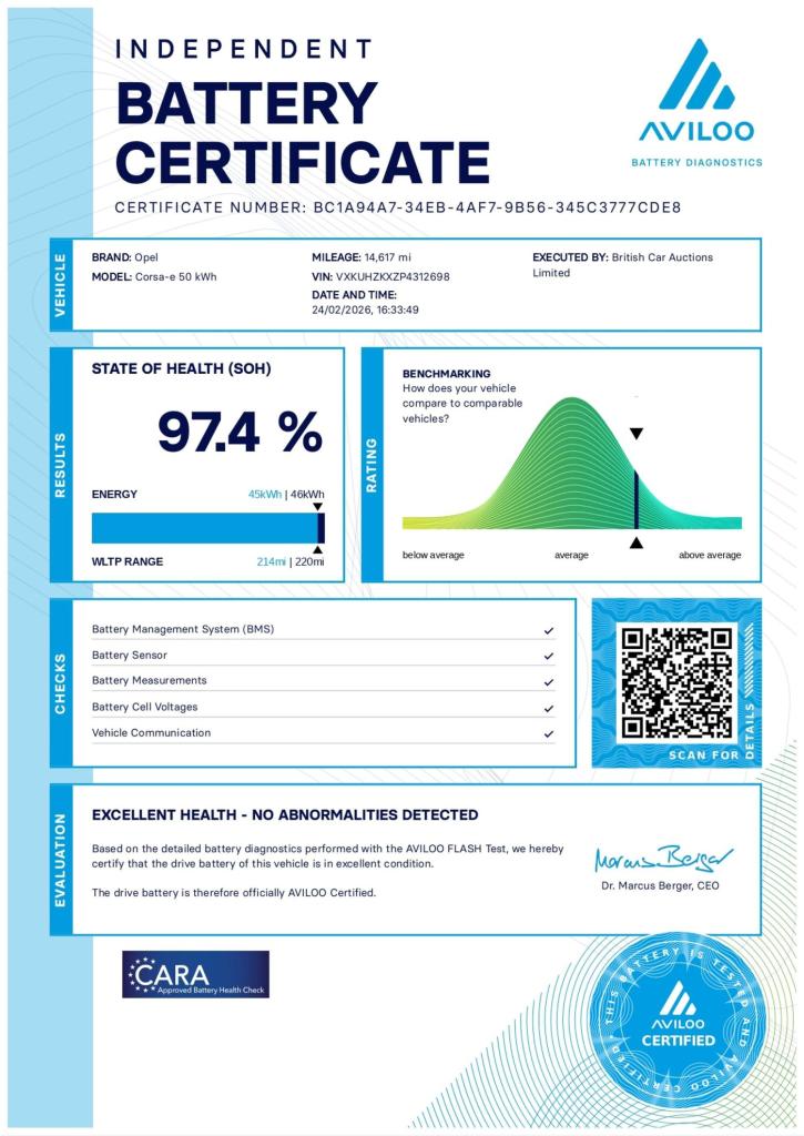 Introducing the Vauxhall Corsa Electric - the perfect blend of style, efficiency, and performance. Finished in a stunning Black colour, the Vauxhall Corsa Electric is sure to turn heads wherever you go. But it's not just about looks - with a powerful 136 ps electric motor under the hood, you'll experience a smooth and responsive drive every time you step behind the wheel.Say goodbye to petrol stations and hello to a more sustainable future with the Vauxhall Corsa Electric. Don't miss out on this fantastic opportunity to own a top-of-the-line electric vehicle. Visit us today and take it for a test drive!Competitive finance is also available.We are open 7 days a week and have more than 1500 cars to choose from.All our Euro 4 Petrol and Euro 6 Diesel vehicles meet the ULEZ standard.Vehicle specification can be found below. From time to time vehicles have manufacturer recalls notified. Please read our recall policy on our website for further information. Please be advised that the advertised electric vehicle (EV) listings may experience battery degradation over time, resulting in reduced performance and range compared to the original specifications. Factors such as usage patterns, environmental conditions, and charging practices can contribute to this degradation. While we strive to provide accurate information, the actual battery health and performance of each EV may vary. Customers are encouraged to conduct thorough research and consider the potential impact of battery degradation before making a purchase decision. We recommend consulting with a qualified technician or conducting a battery health inspection for further assessment. This vehicle comes with an AVILOO Battery Health Certificate - the global standard for EV battery testing. Full independent analysis confirms excellent battery condition with detailed State of Health assessment, cell-level checks, and accurate range data. Certificate included with purchase for your complete peace of mind and future resale value.Disclaimer: While every effort is made to ensure the accuracy of vehicle specifications, features, and descriptions, errors and omissions may occur. Specifications and equipment may vary and may not be present on the vehicle at the point of sale. Buyers are advised to confirm all details with the seller before completing a purchase.