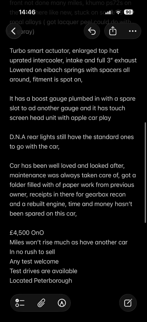 Just had some zestino gredge 07r put on the front not done many miles, khumo ps72s on the rear there like new, stuck on some 19” ronal alloys ( got lacquer peel could do with re spray)