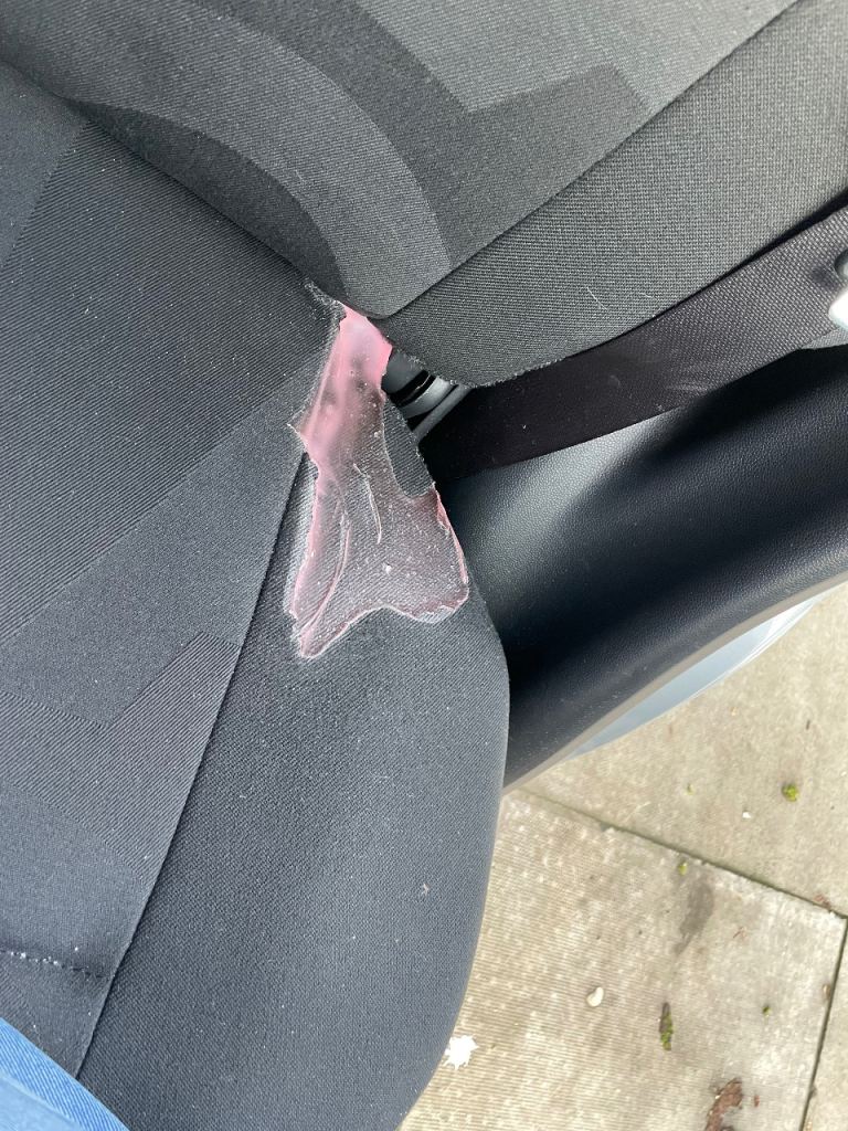 Children's putty spilled on rear seat - £200 off asking price until I somehow scrape it off! Itooks terrible but is solid so doesn't affect the usability of the seat.