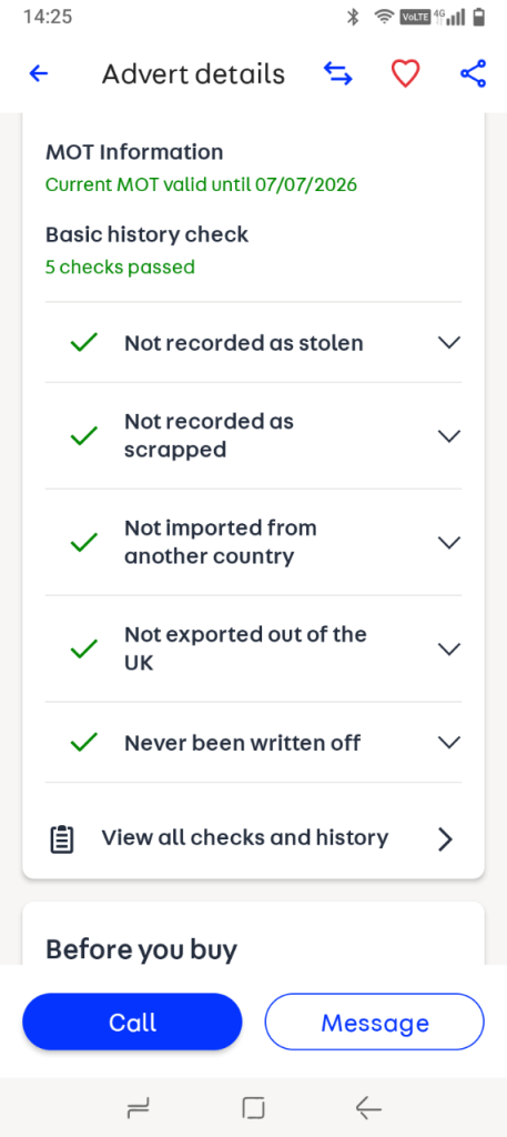 Our vehicle history check is provided for guidance only. Please check all the details with the seller before purchasing