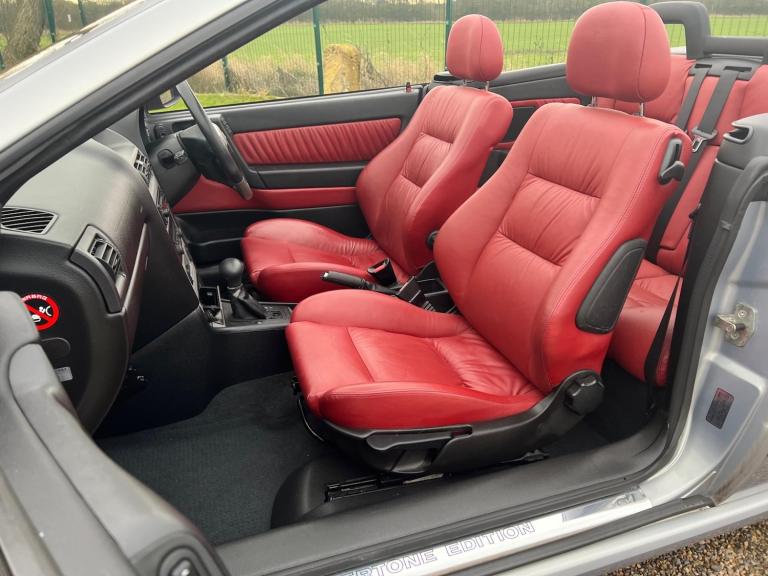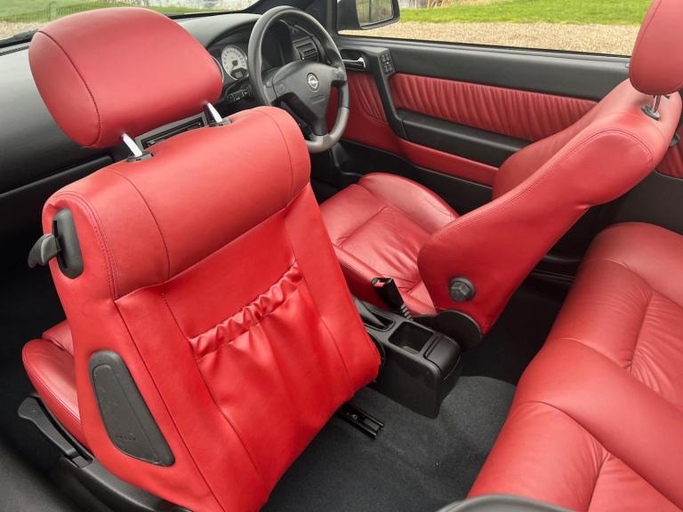 We have the original handbook service record which consists of 11 entries up to 38000 miles.The Astra is a Bertone design Cabriolet in Mirage Blue metallic with a contrasting blue Mohair Power roof which is exceptional condition , Full Red leather seats with heated front seats , Rare sports steering wheel with stereo controls , radio and mini disc player , Alloy wheels , Store away ( special area in trunk ) or leave in place rear wind deflector which can cover over the rear seats as seen in the pictures , factory mats with immaculate carpets beneath (like new) .