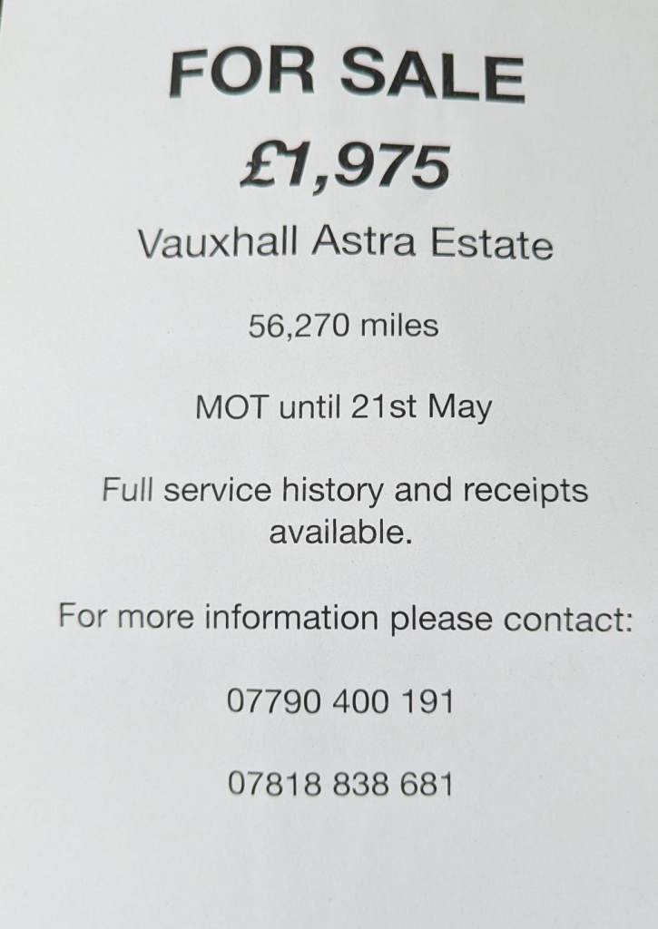 Vauxhall astra estate with low mileage for its age. A good workhorse, full service history and receipts of all recent work done.