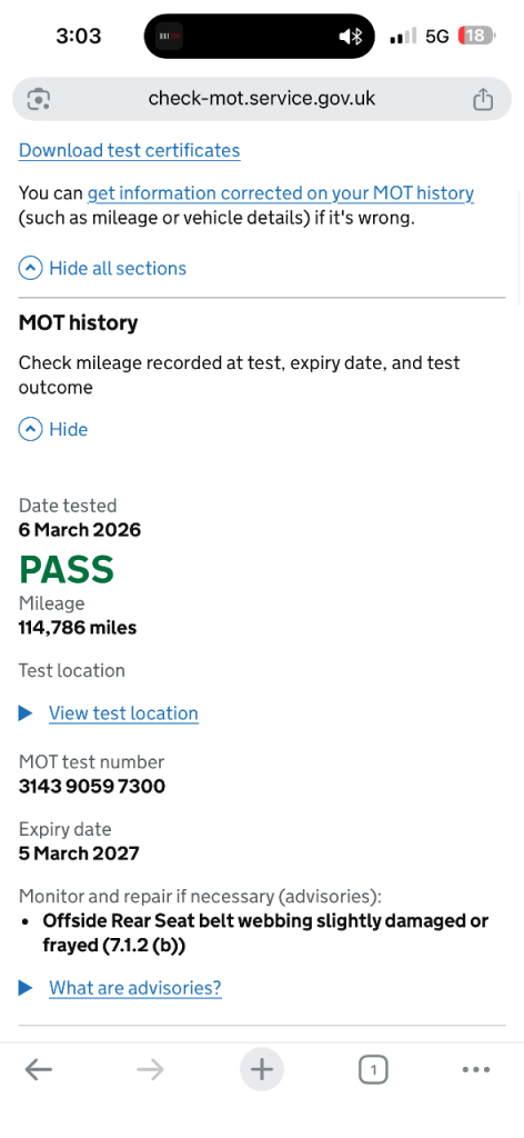 !!!!!!!! MOT carried out today passed with no problems !!!!!!!!!!
