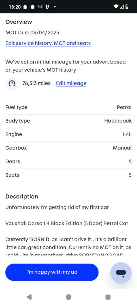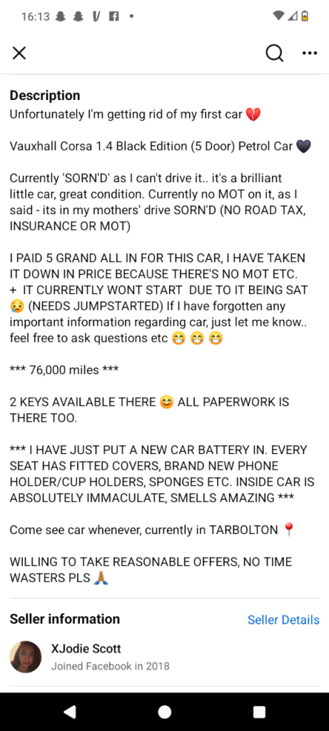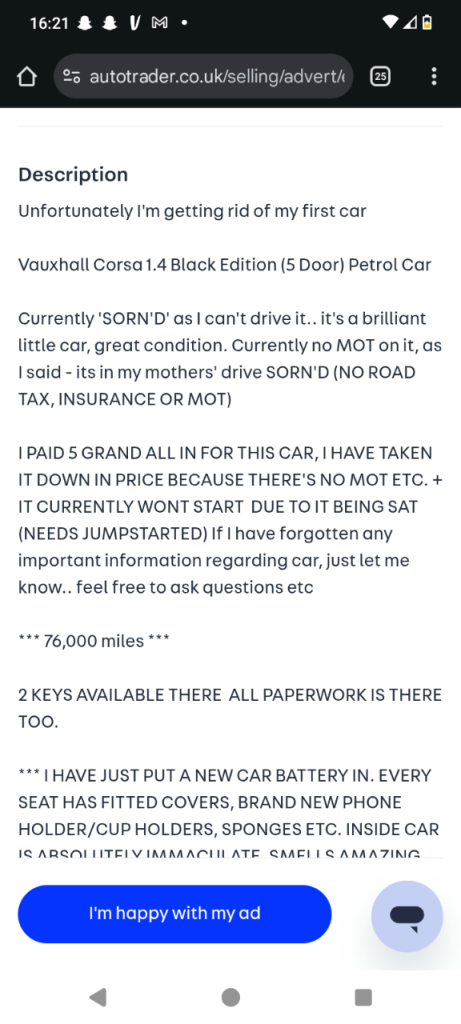 I PAID 5 GRAND ALL IN FOR THIS CAR, I HAVE TAKEN IT DOWN IN PRICE BECAUSE THERE'S NO MOT ETC. + IT CURRENTLY WONT START DUE TO IT BEING SAT 😢 (NEEDS JUMPSTARTED) If I have forgotten any important information regarding car, just let me know.. feel free to ask questions etc 😁 😁 😁