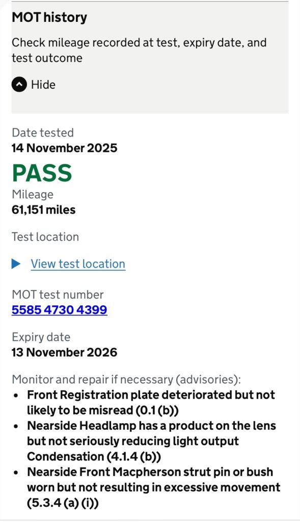 It’s now on £61k miles and going up daily, had MOT in November with a few advisories.