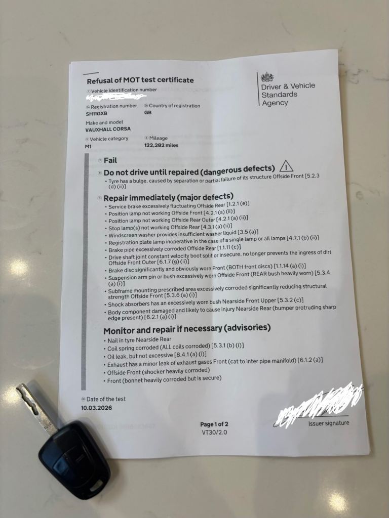 Selling my Corsa SRI as it has recently failed its MOT and I don’t want to spend the money repairing it. The car starts, runs and drives well but will need work to pass the MOT.