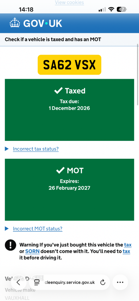 This vehicle has not been reported stolen, scrapped, exported or flagged as unroadworthy.