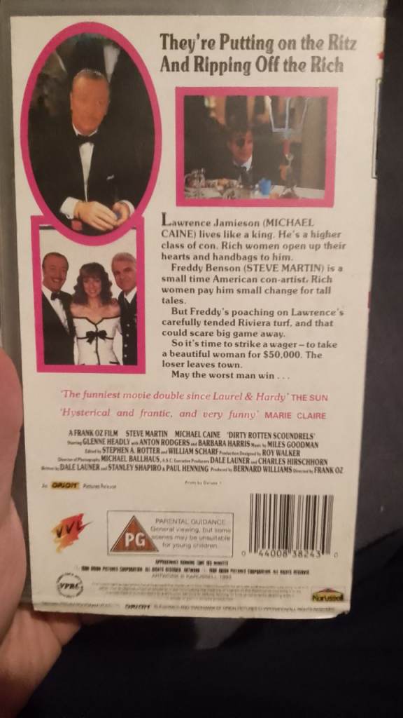 This listing is for a VHS video features that the classic comedy film "Dirty Rotten Scoundrels" starring Michael Caine and Steve Martin. Small VHS video box released in 1993. Item in good condition. Any questions please ask.