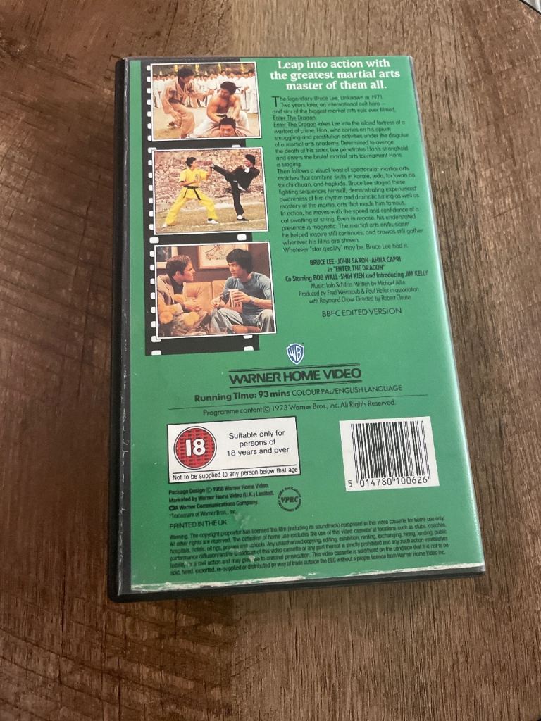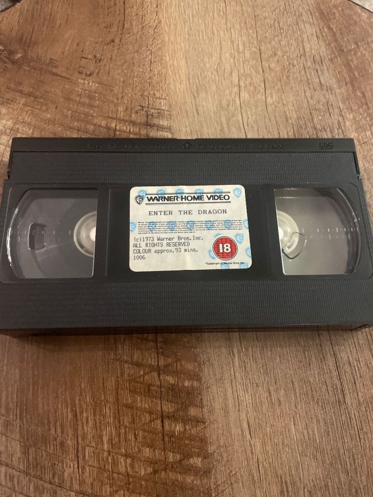 Enter the dragon is a original 1973 vhs tape staring Bruce Lee martial arts master , running time off 93 mins , from Warner home video with a certificate of 18 .in a small black case with Warner brothers embossed logo in side cover in ex ex condition,