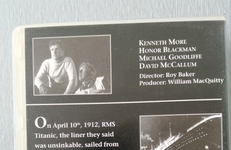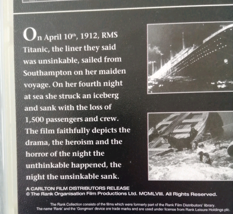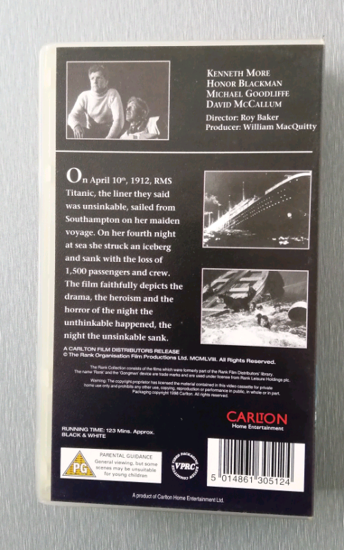 A VHS video film: A Night to Remember. A 1950's Titanic Film in black and white which was made into a vhs video in black and white in 1998. This is one of the early films made in 1958 of the sinking of the unsinkable Titanic on her maiden voyage. This is a very sobering account of that night. Some good actors when they were much younger (for those who remember). They include Kenneth More, Honor Blackman, David McCallum, Michael Goodlife and others. The quality is typical technology of the period but is still very watchable. Technology has come a long way since the 50's so to get the best out of it gorget technology and just watch it. I watched this as a film (2/3 times) on a black and white TV in the 60's when I was in my teens. It and another version was often shown around Christmas and the New Year. I always stayed in to watch whichever was showing. The sinking of the Titanic was a mind blowing tragedy with hard lessons learnt. I have also watched this video a few times and much prefer it to the present day version which in my opinion is nothing more than a drama/romance. It was last played on 13th January 2024 and it still plays acceptable. The case is good and clean. Reason for selling is because I am downsizing my video collection and I would like to think someone else would appreciate this version of events. It can be collected or posted. I have other items that I am selling and would be happy to combine.