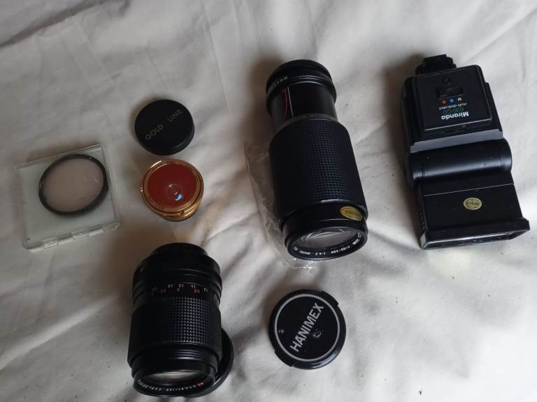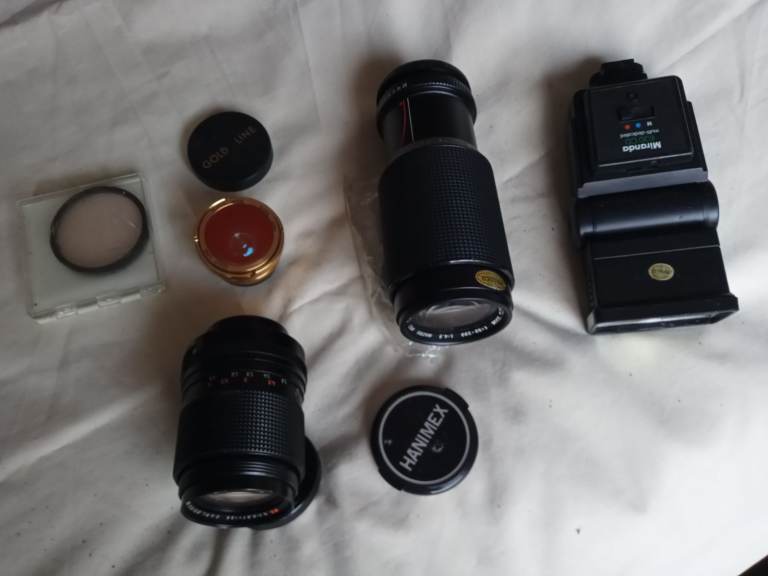 Hanimex 80-200 zoom lens.135zoom lens.gold line wide angle lens.All screw fit Converter adapter . Various lens caps.miranda flash gun.shoulder camera bag for all your equipment.cash only