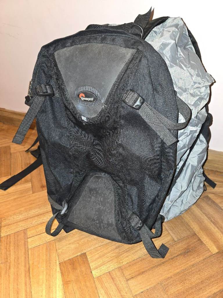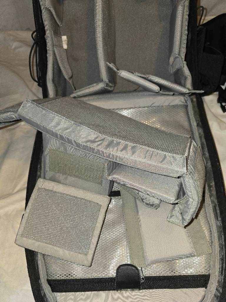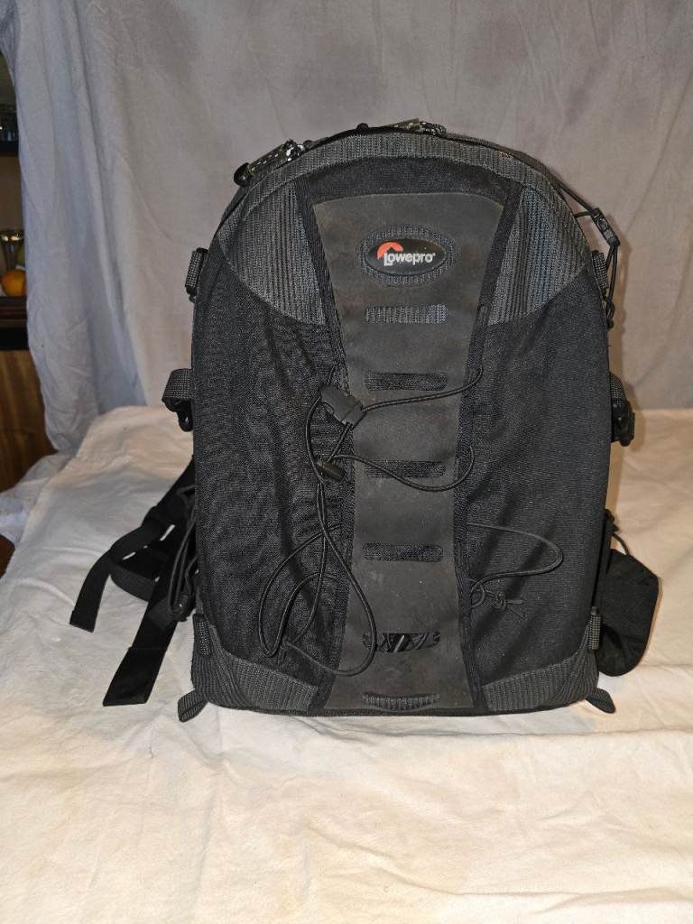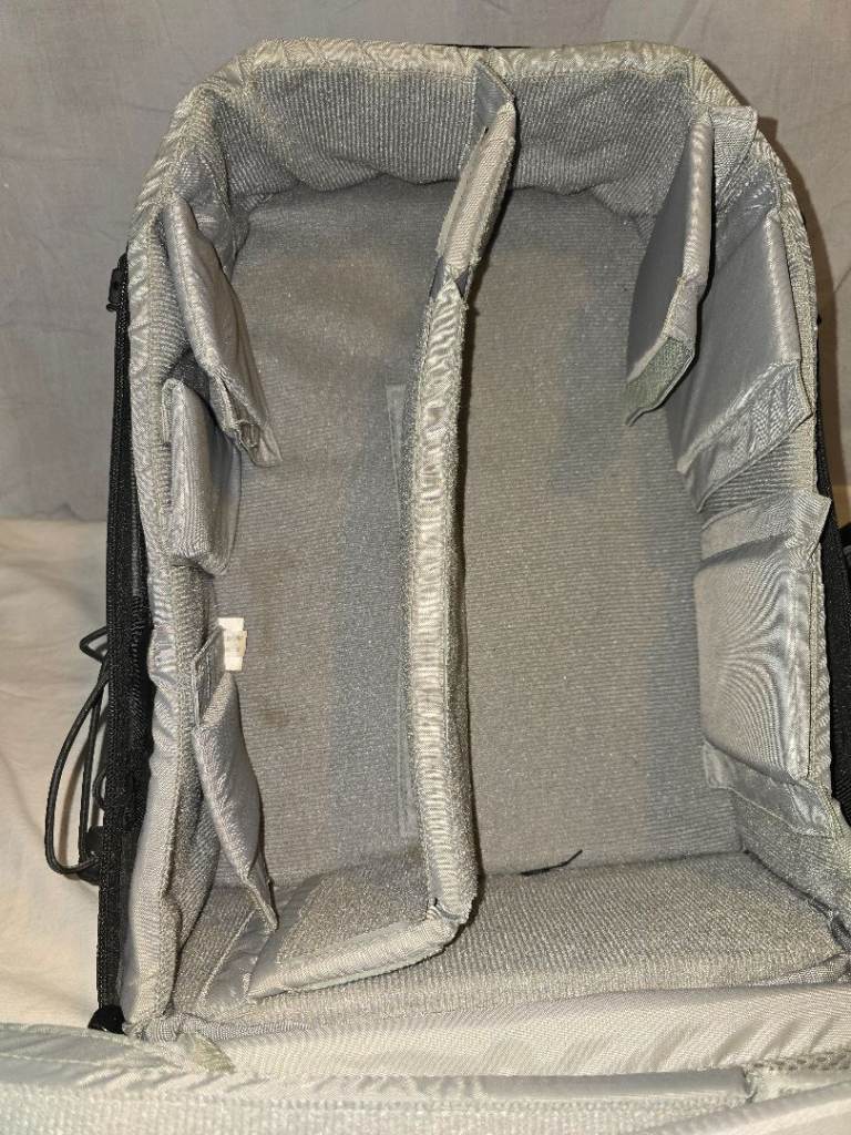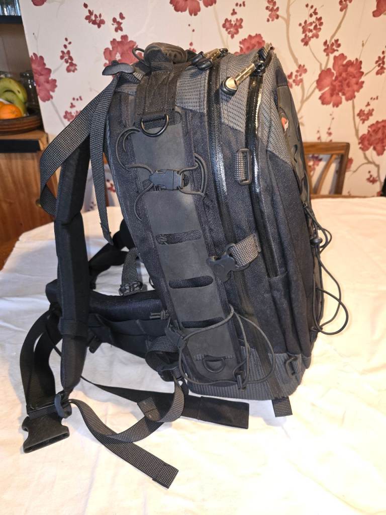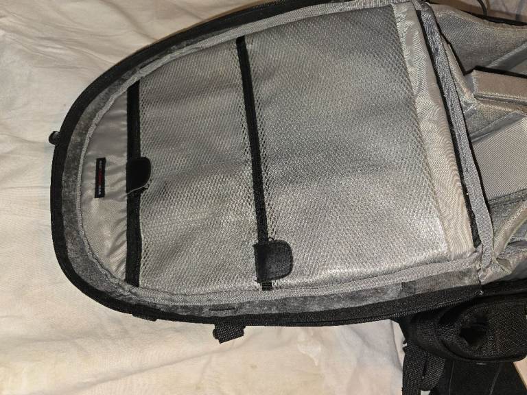 Camera and lens rucksack velcro dividers about 14 so you can divide to suit your lenses and cameras .A quality rucksack designed to keep you lenss and cameras safe and secure Zippers are waterproof design and there is a sewn in cover to protect the whole bag during heavy rain .there is a water bottle ,holder it will also carry a tripod on the outside along with a number of elastic straps that would hold a jacket and hat .also with the bag is a daysack which has been used more that the rucksack useful for flask and sandwiches