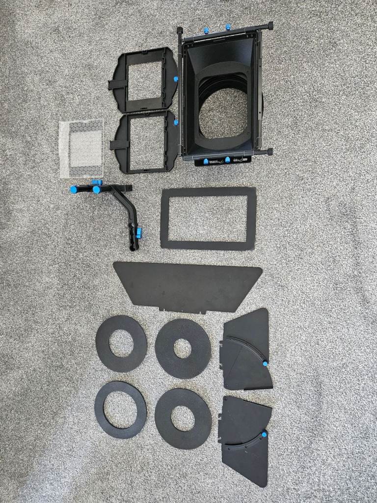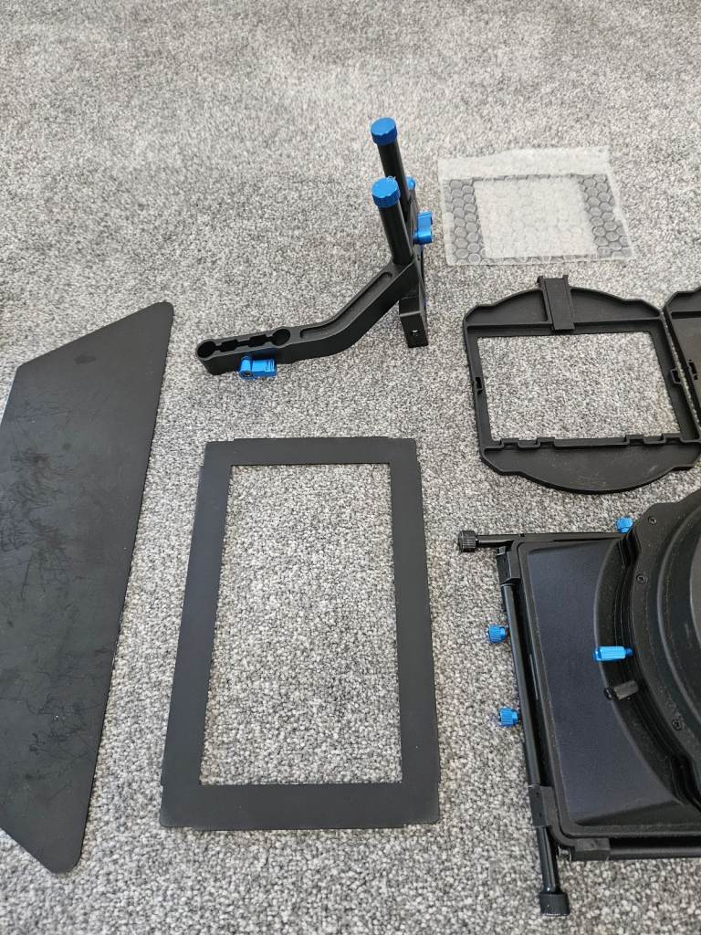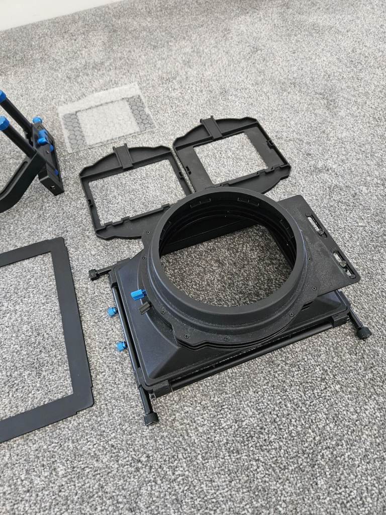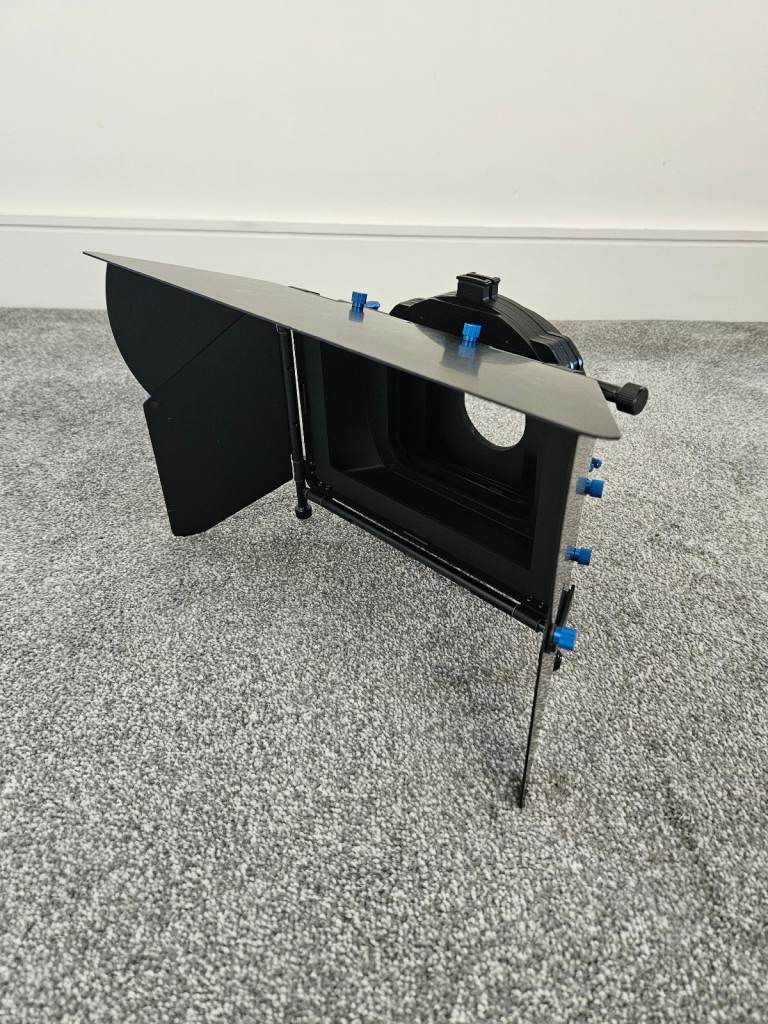 Large Matte box is 15mm rod mounted and is prefect for protecting any camera lens from the sun eliminating lens flare and shadowing. Featuring a swing away feature allows for quick and easy lens changes but also allows 4x5.65 filters and 4x4 filters with included adaptor. has adjustable fixings to accommodate different size lenses. Bought for a specific project but never really got used so in excellent condition with general wear and tear.