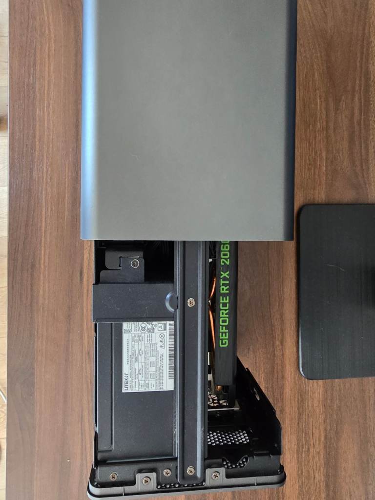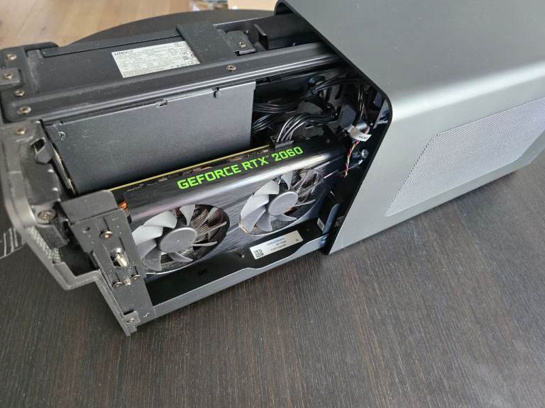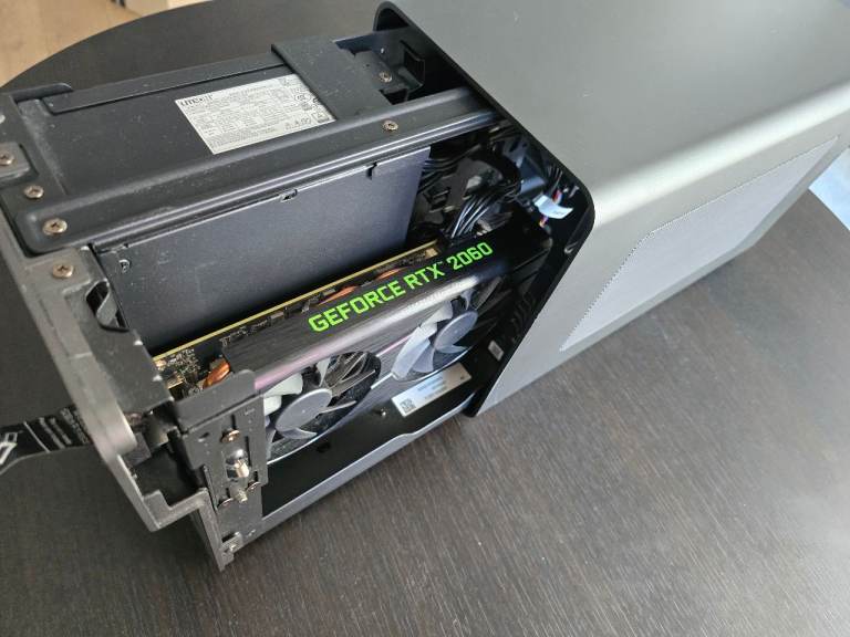 External GPU aluminium enclosure, comes with graphics card RTX2060, and a thunderbolt cable.