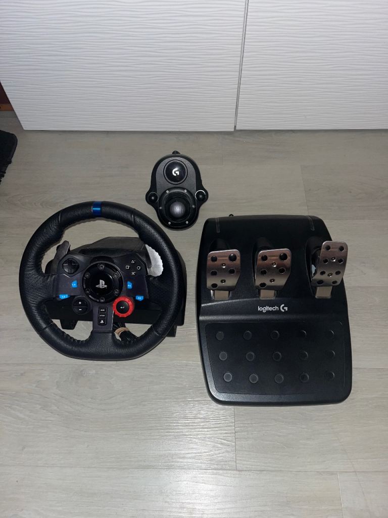 Logitech G29 driving force steering wheel set including pedals and gear shifter.