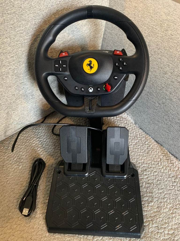 Includes racing wheel, pedal set, and all required cables (cable to connect wheel to pedals, and USB-A to USB-C cable to connect the set to Xbox / PC).