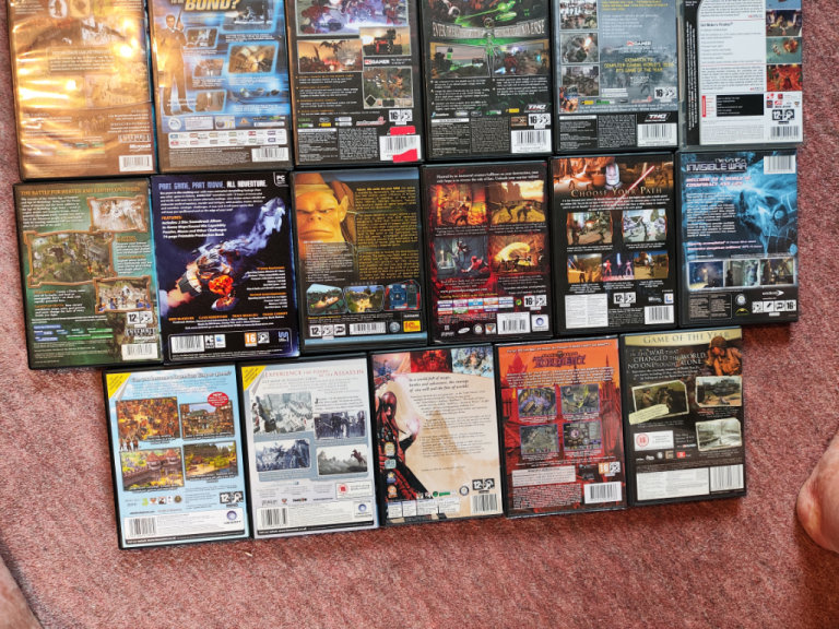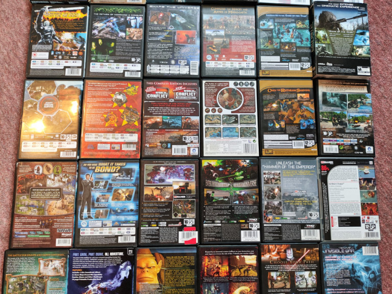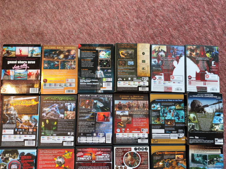 The overall condition of the games and expansions are very good to excellent. Of the games that are open and have been played, only a few of the CD's/DVD's have scratches and were all playable the last time they were played. The cases are pretty much as per the pictures.