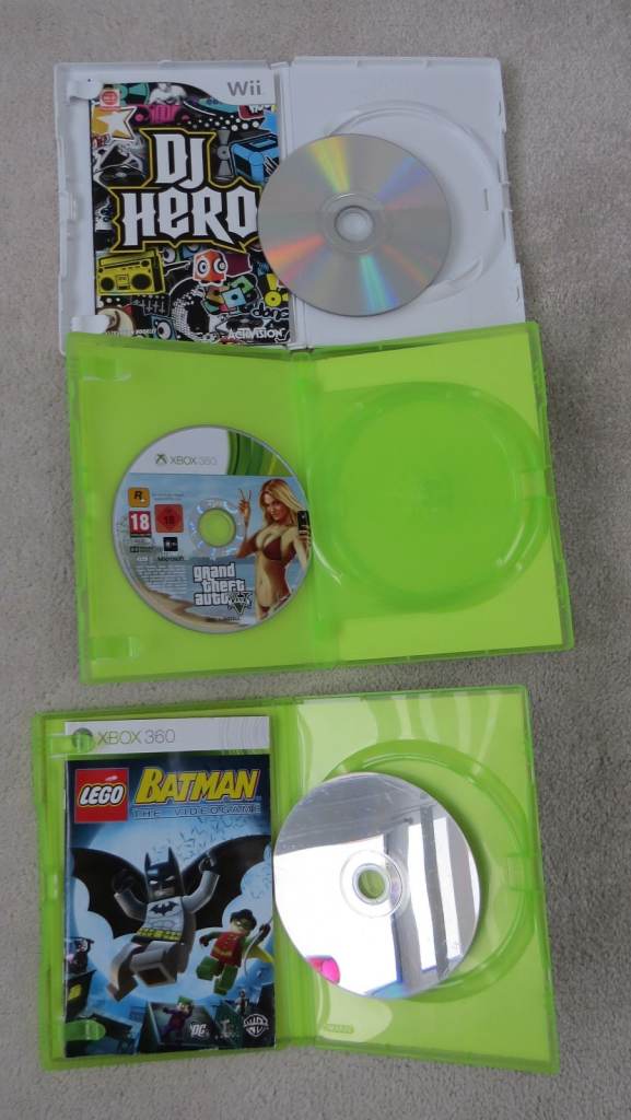 XBOX 360: DJ Hero, Lego Batman (disc scratched), Tom Clancy's Ghost Recon Advanced Warfighter, Grant Theft Auto V (disc 1 only and no manual)