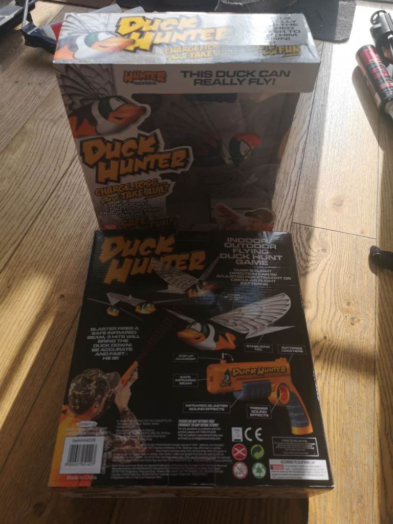 Just charge up the mechanical duck on the barrel of the infrared gun for 10 seconds and it actually flies around the room for around 30 seconds.