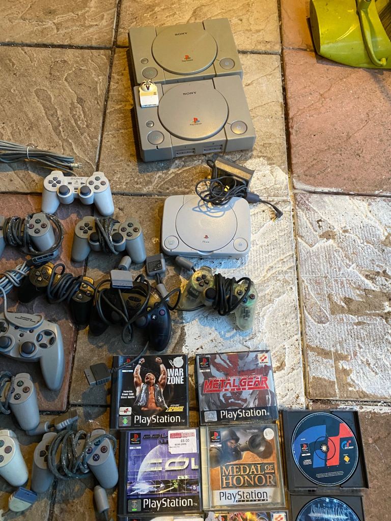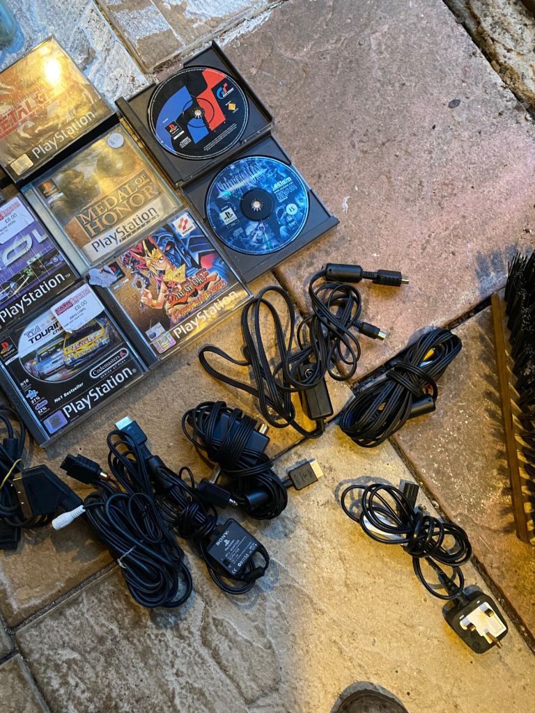 Joblot of PlayStation one, including couple of cables and controllers.
