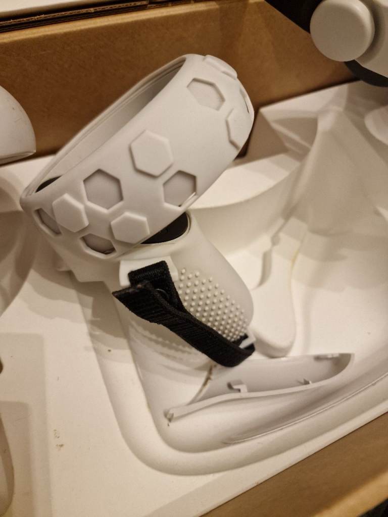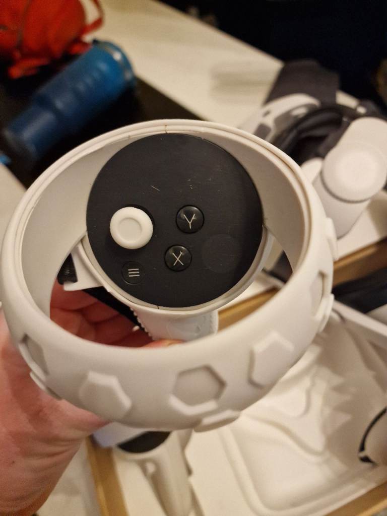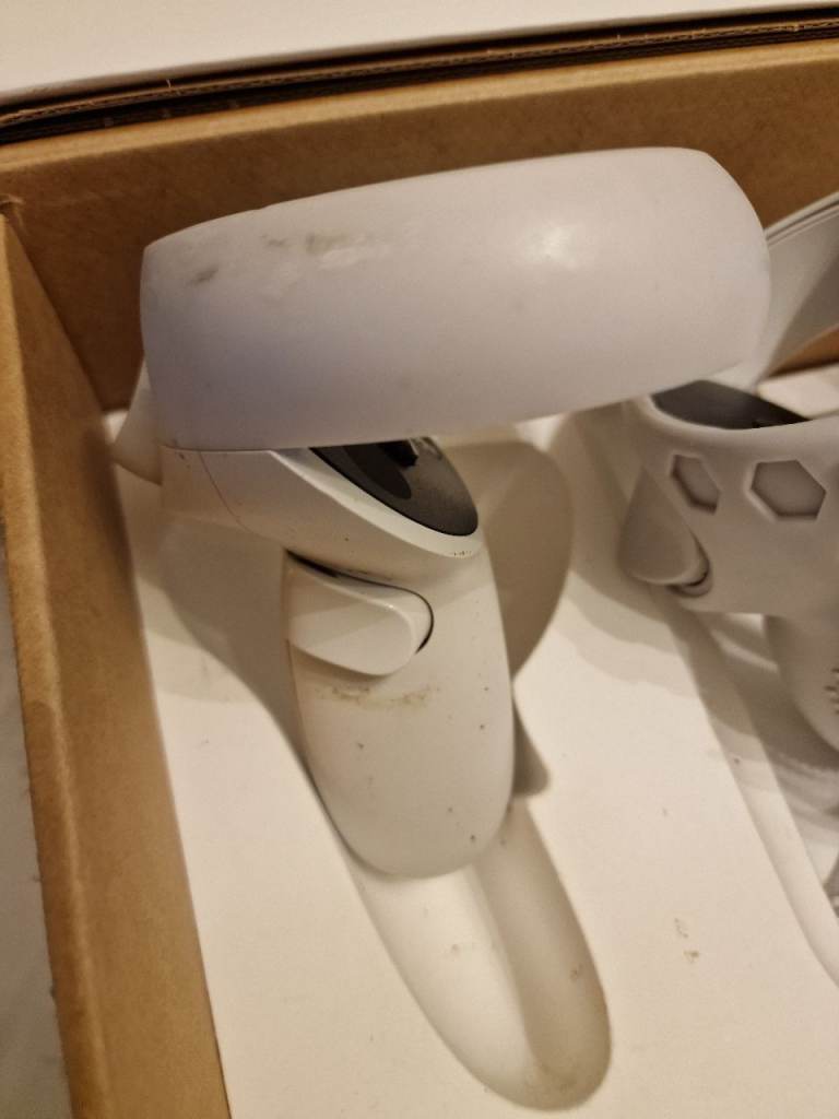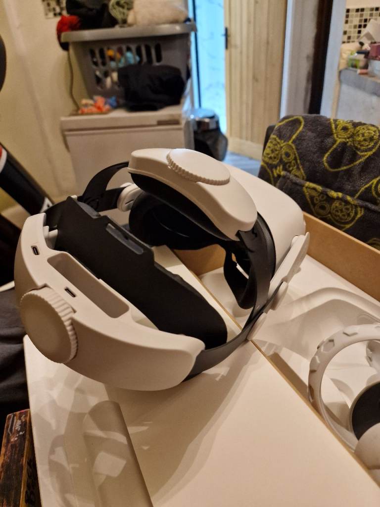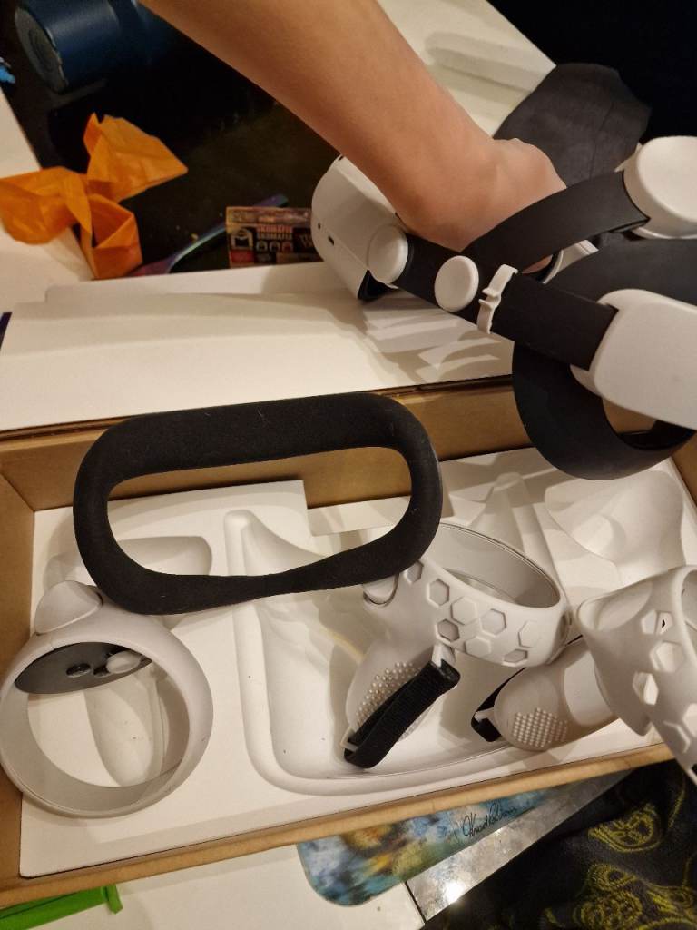 meta quest 2 with box both controllers all in working order. only negative in condition is a slight chip on one of the controllers shown in picture. upgraded controllers so analogue sticks instead of buttons, upgraded head strap. silicone covers for controllers for extra grip. No charge cable.