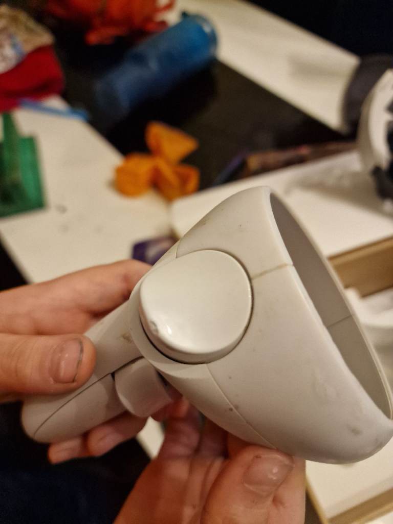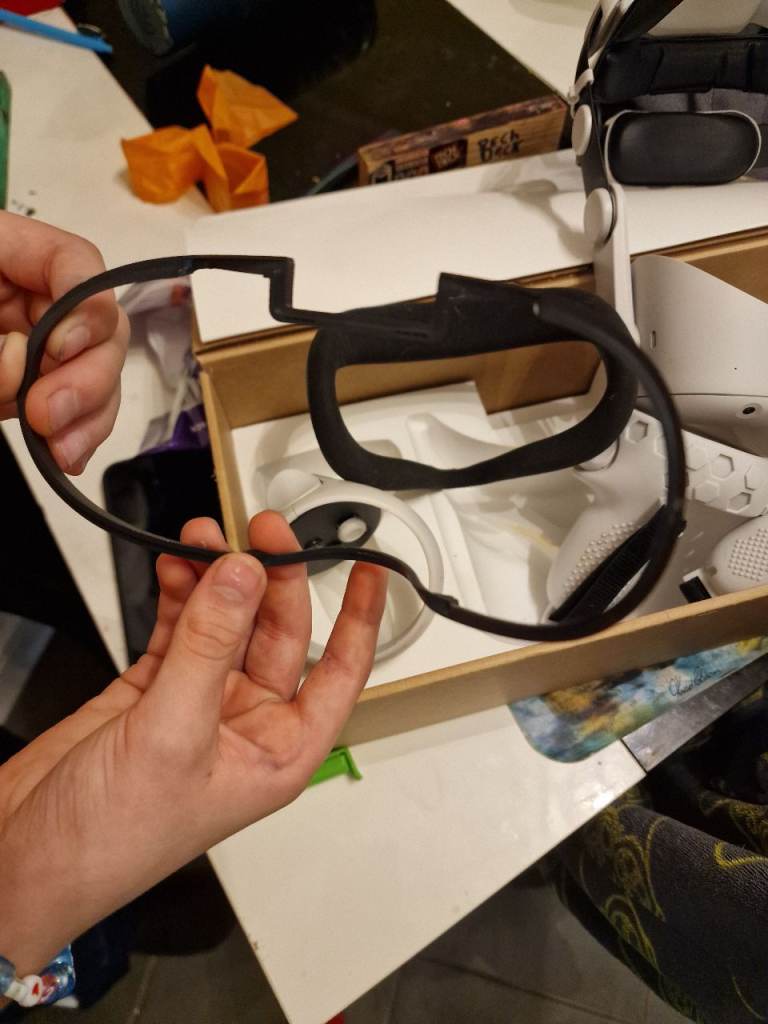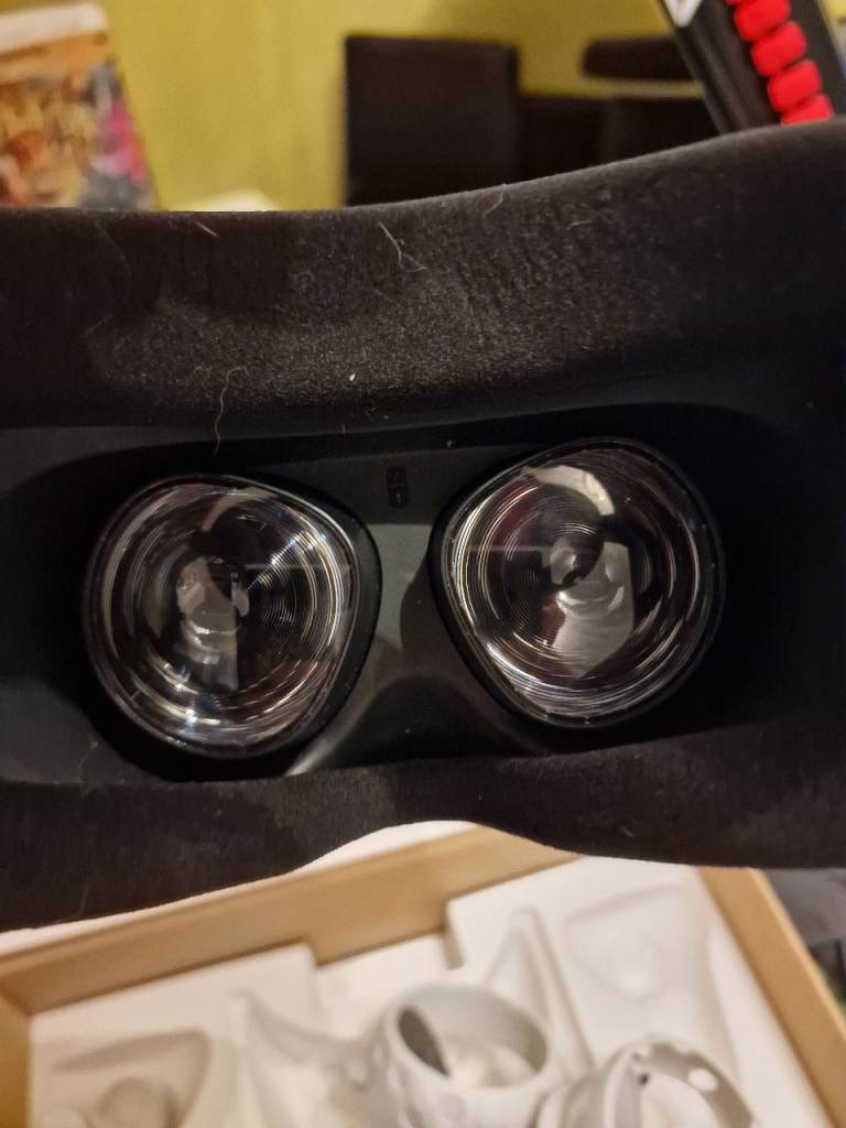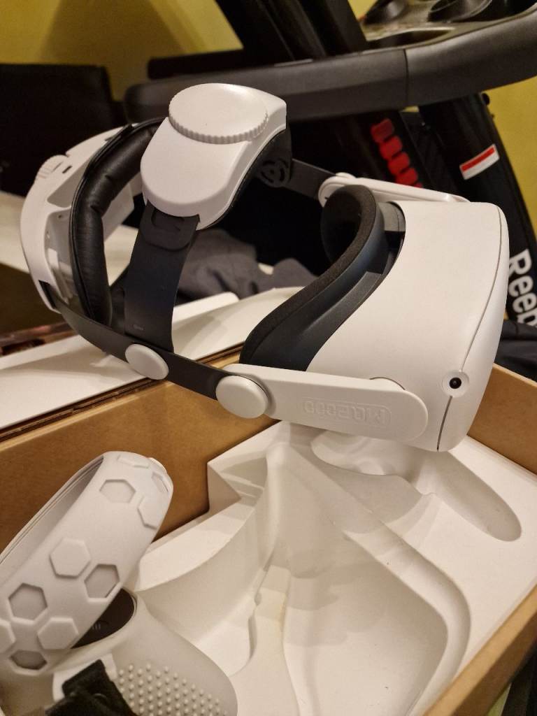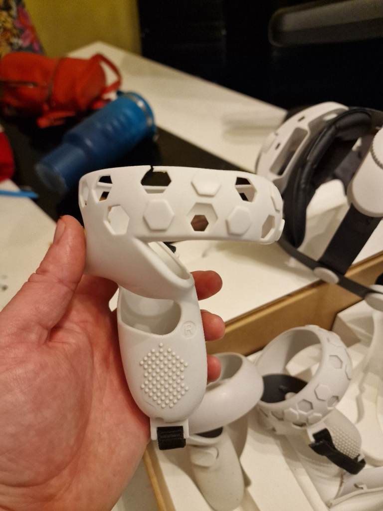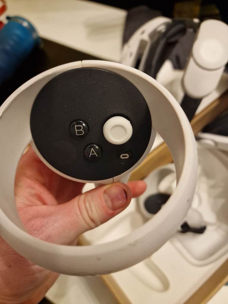 meta quest 2 with box both controllers all in working order. only negative in condition is a slight chip on one of the controllers shown in picture. upgraded controllers so analogue sticks instead of buttons, upgraded head strap. silicone covers for controllers for extra grip. No charge cable.